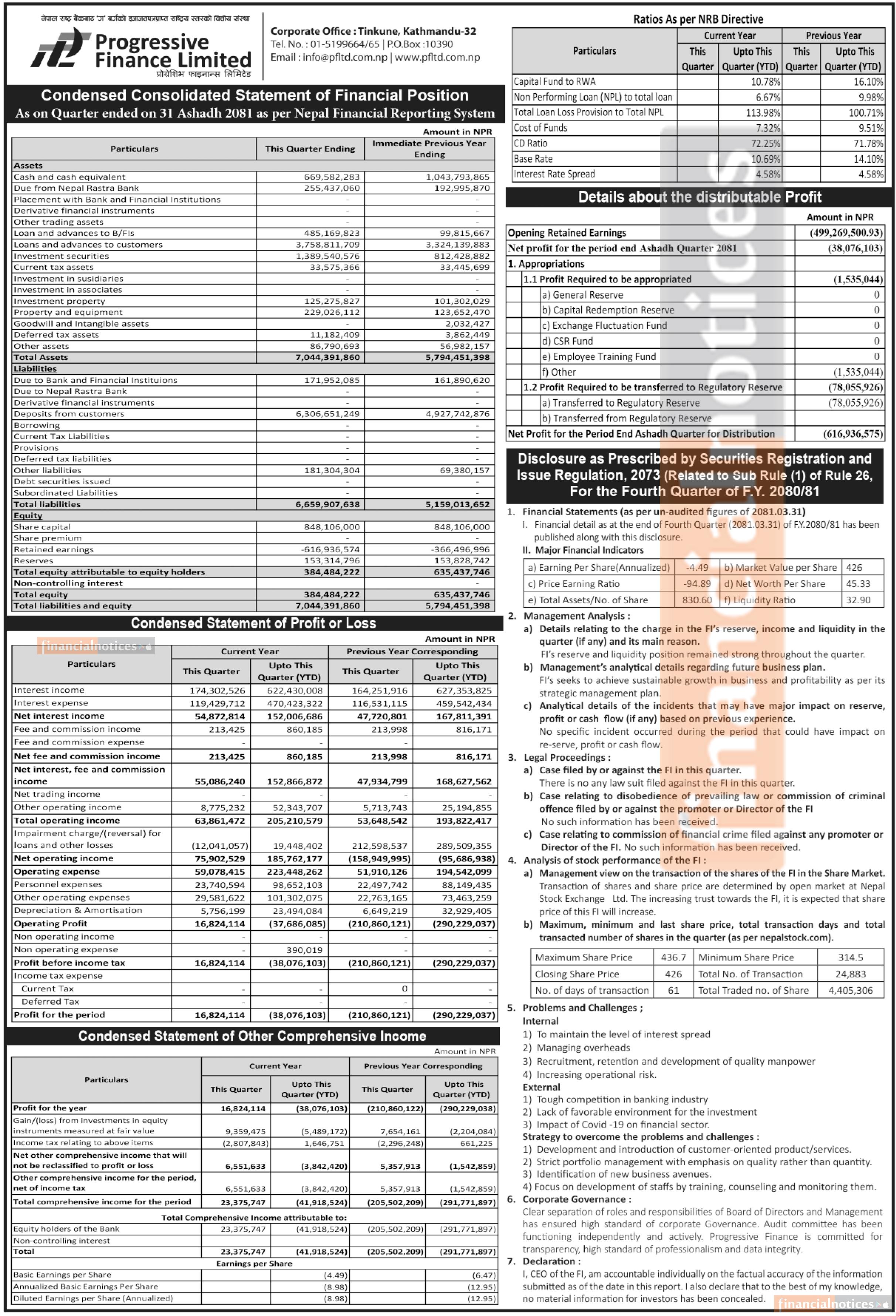 प्रोग्रेसिभ फाइनान्सको खुद घाटा ३ करोड ८० लाख रुपैयाँ - Q4 Report -