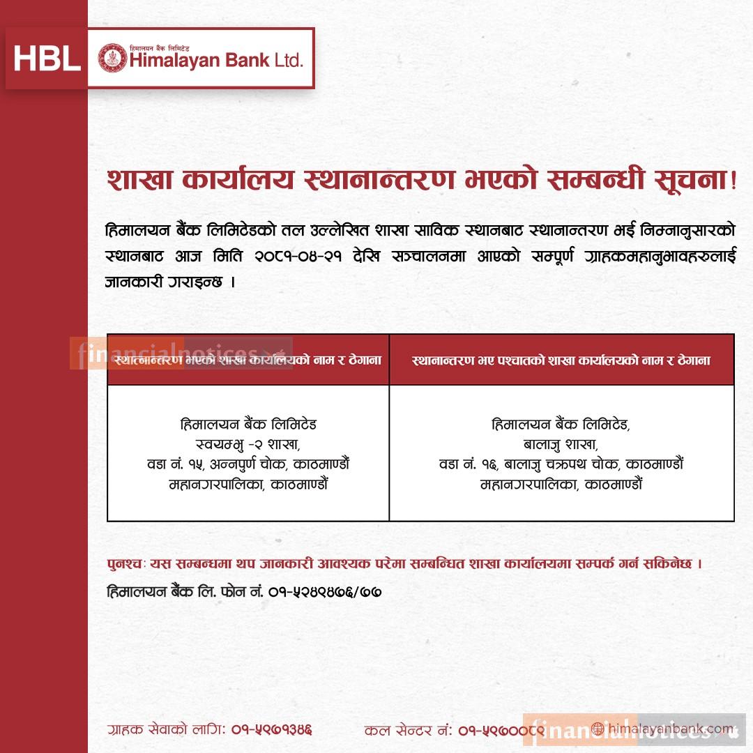 हिमालयन बैंकको शाखा स्थानान्तरण सम्बन्धी सूचना