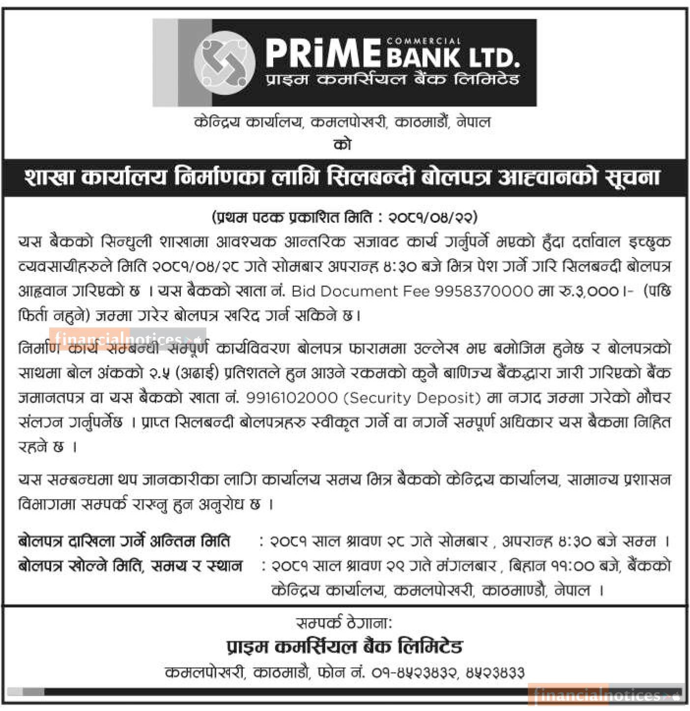बैंकको शाखा कार्यालय निर्माणका लागि सिलबन्दी बोलपत्र आह्वानको सूचना -