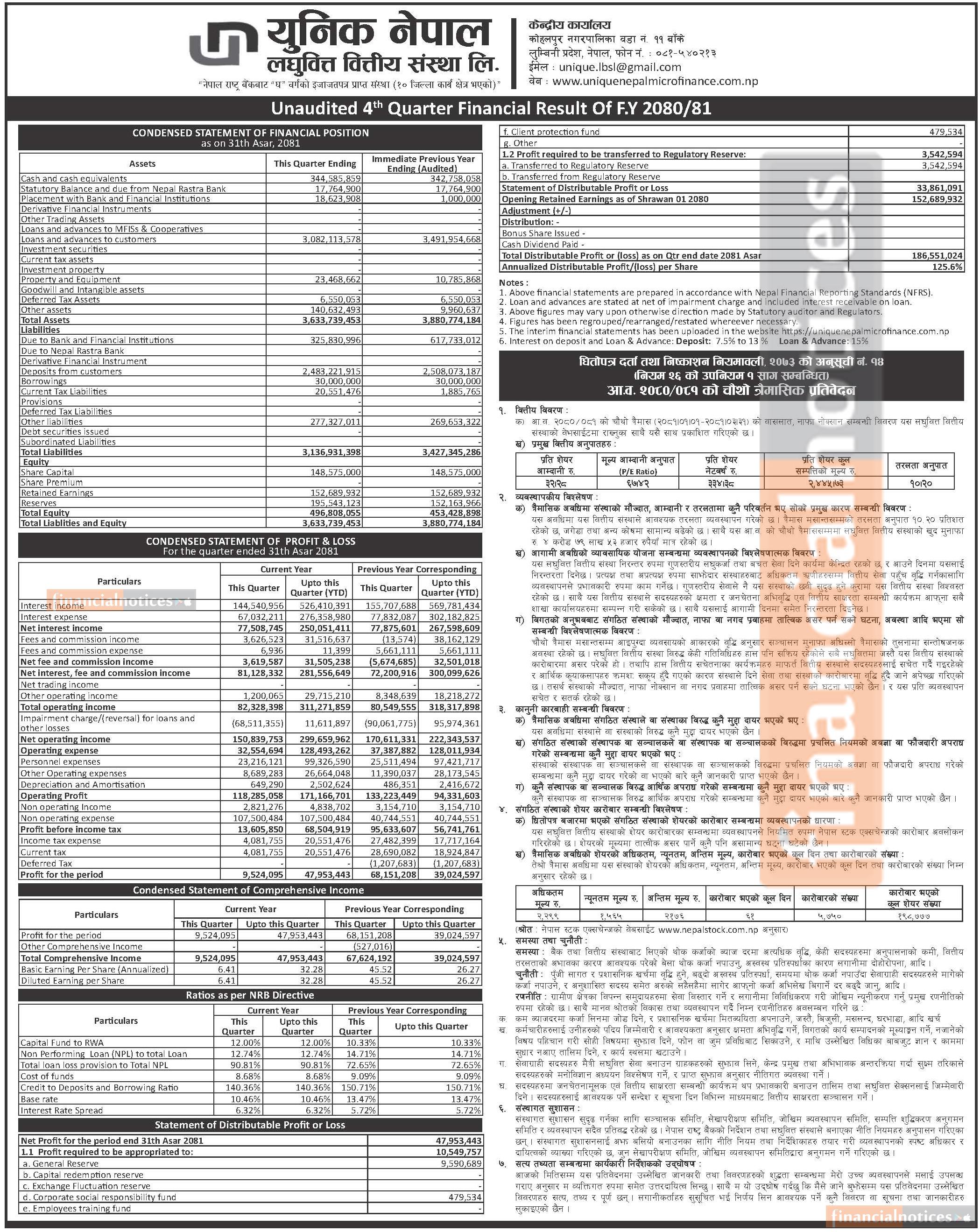 यूनिक नेपाल लघुवित्तको खुद नाफा ४ करोड ७९ लाख ५३ हजार रुपैयाँ - Q4 Report -