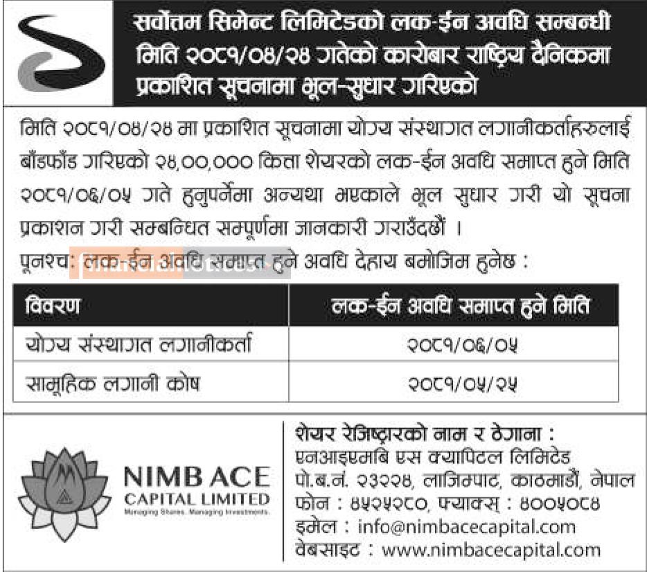सर्वोत्तम सिमेन्टको लक इन अवधि सकिने मितिमा भुलसुधार बारेको सूचना