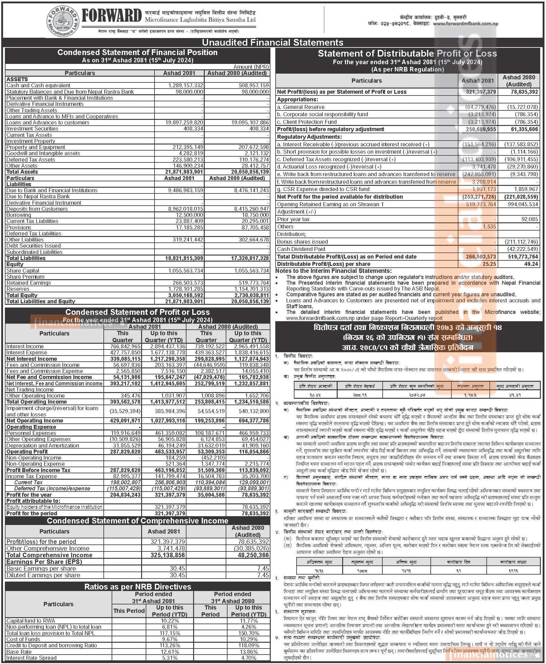 फरवार्ड माइक्रोफाइनान्सको खुद नाफा ३०८.७२ प्रतिशतले बढेर ३२ करोड १३ लाख ९७ हजार रुपैयाँ - Q4 Report-