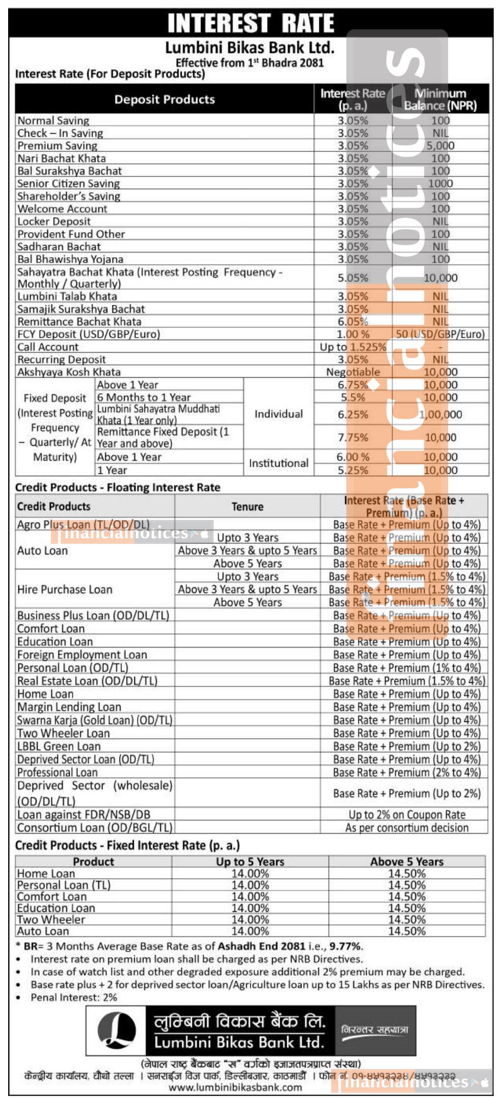 लुम्बिनी विकास बैंकको नयाँ ब्याजदर सार्वजनिक, भाद्र एक गतेदेखि लागु हुने - Interest Rates Notice -