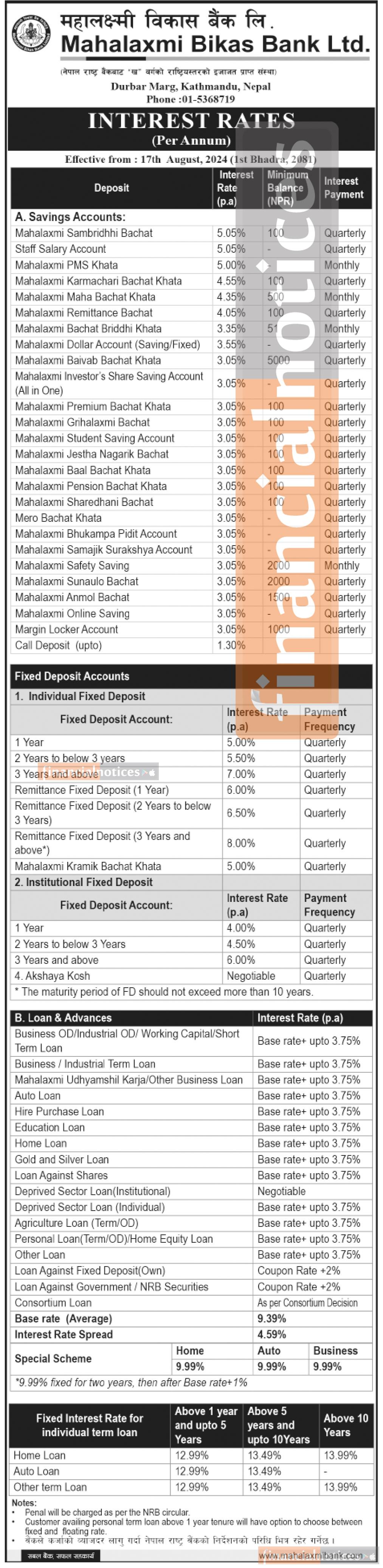 महालक्ष्मी विकास बैंकको नयाँ ब्याजदर सार्वजानिक - Interest Rates Notice -