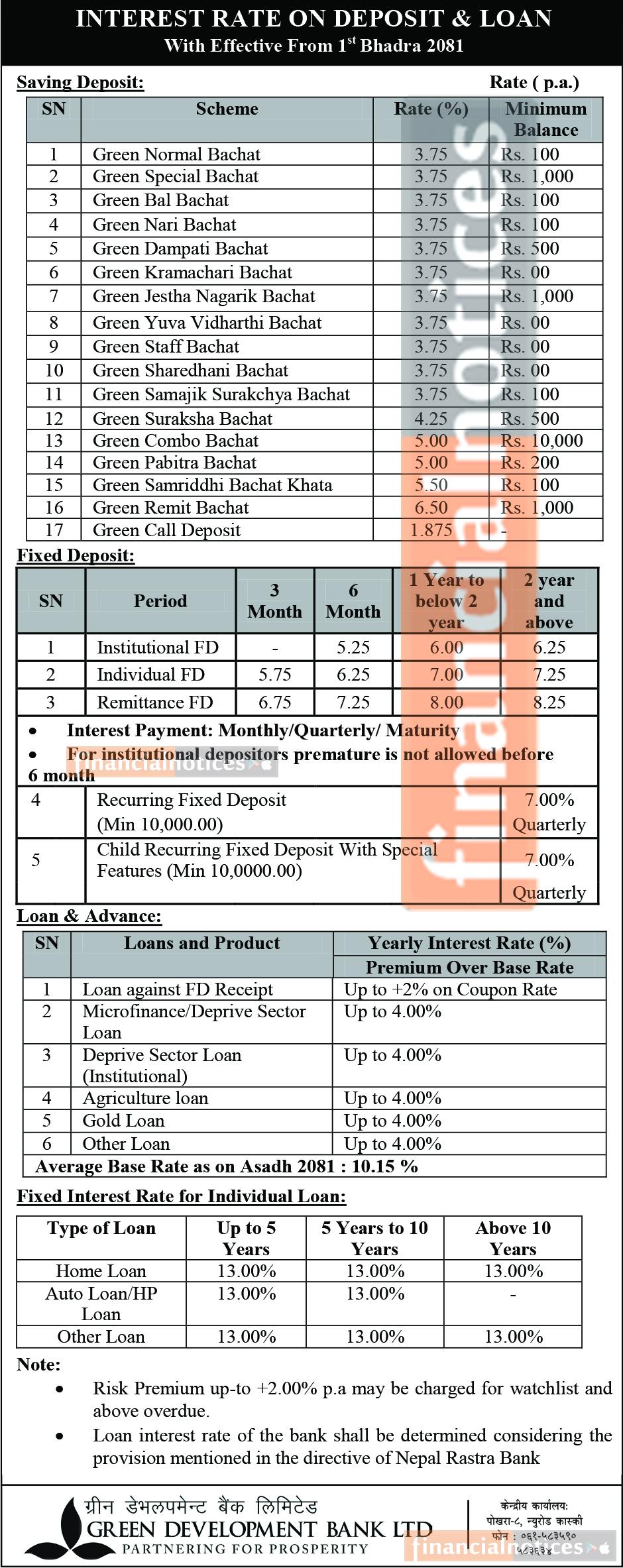 जेष्ठ महिनाका लागि ग्रीन डेभलपमेन्ट बैंकको नयाँ ब्याजदर सार्वजनिक