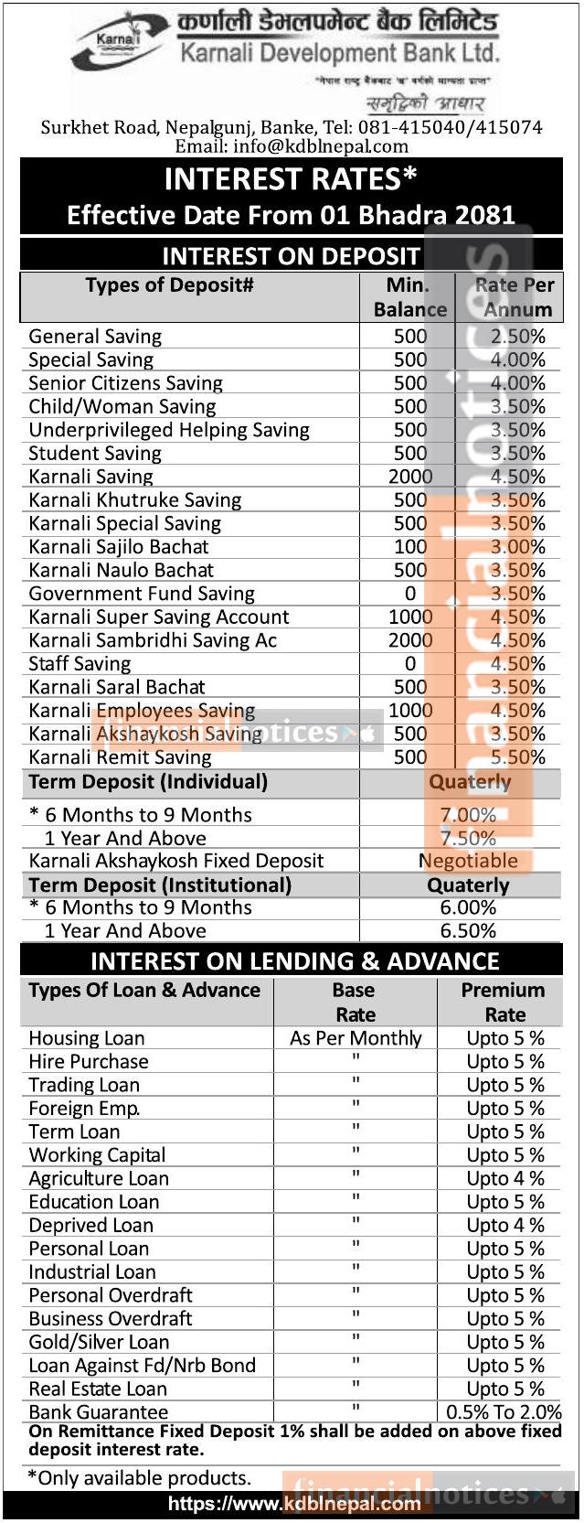New Interest Rates Effective from 1st Bhadra, 2081 – Karnali Development Bank