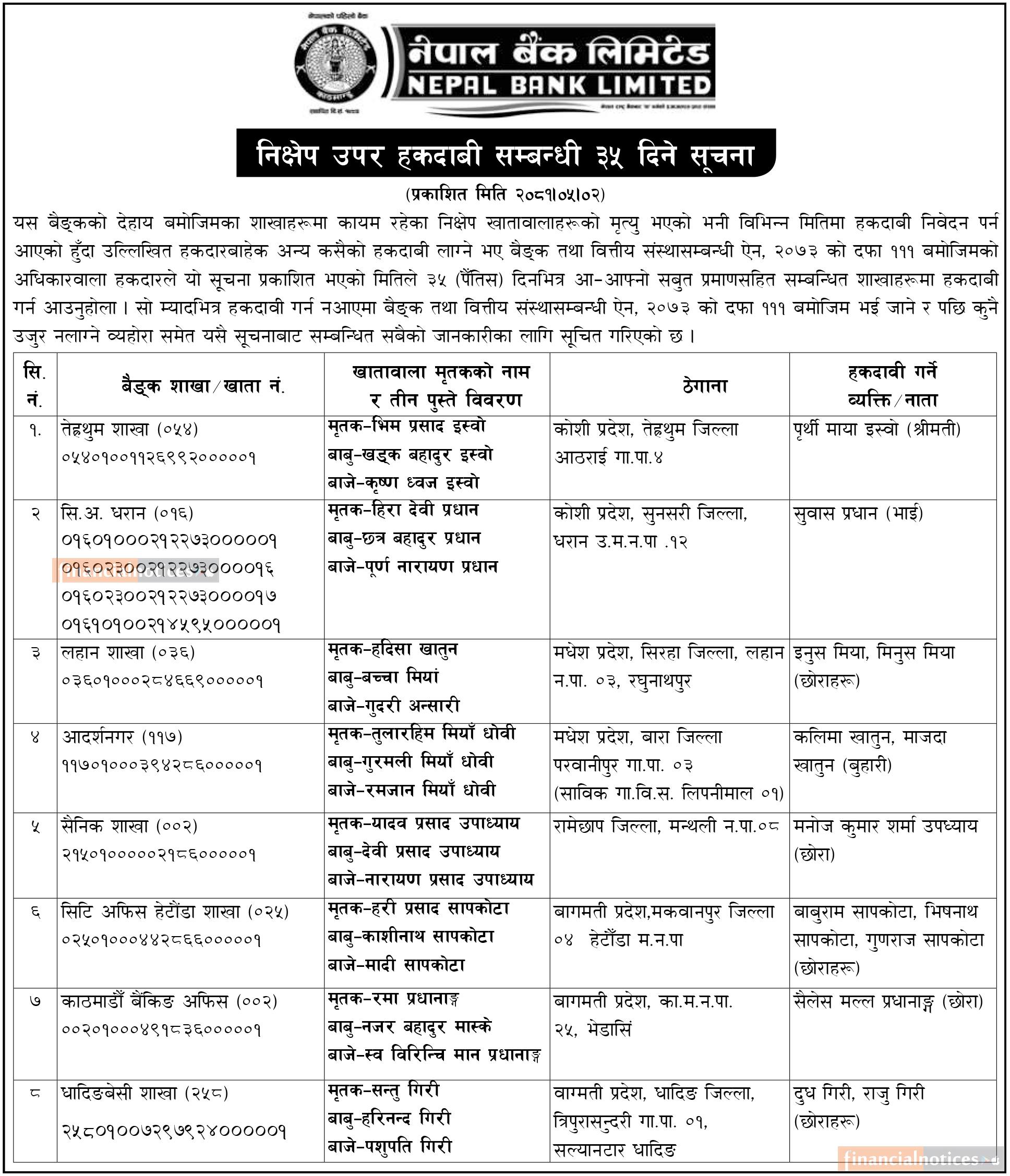 निक्षेप उपर हकदावी सम्बन्धी ३५ दिने सूचना