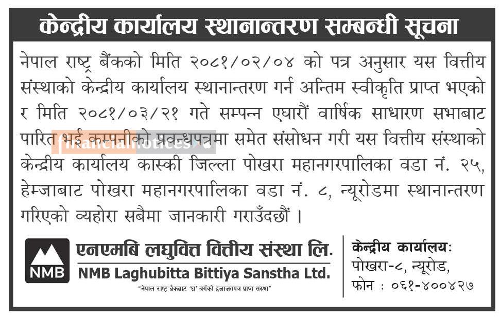 लघुवित्तको केन्द्रीय कार्यालय स्थानान्तरण सम्बन्धी सूचना -