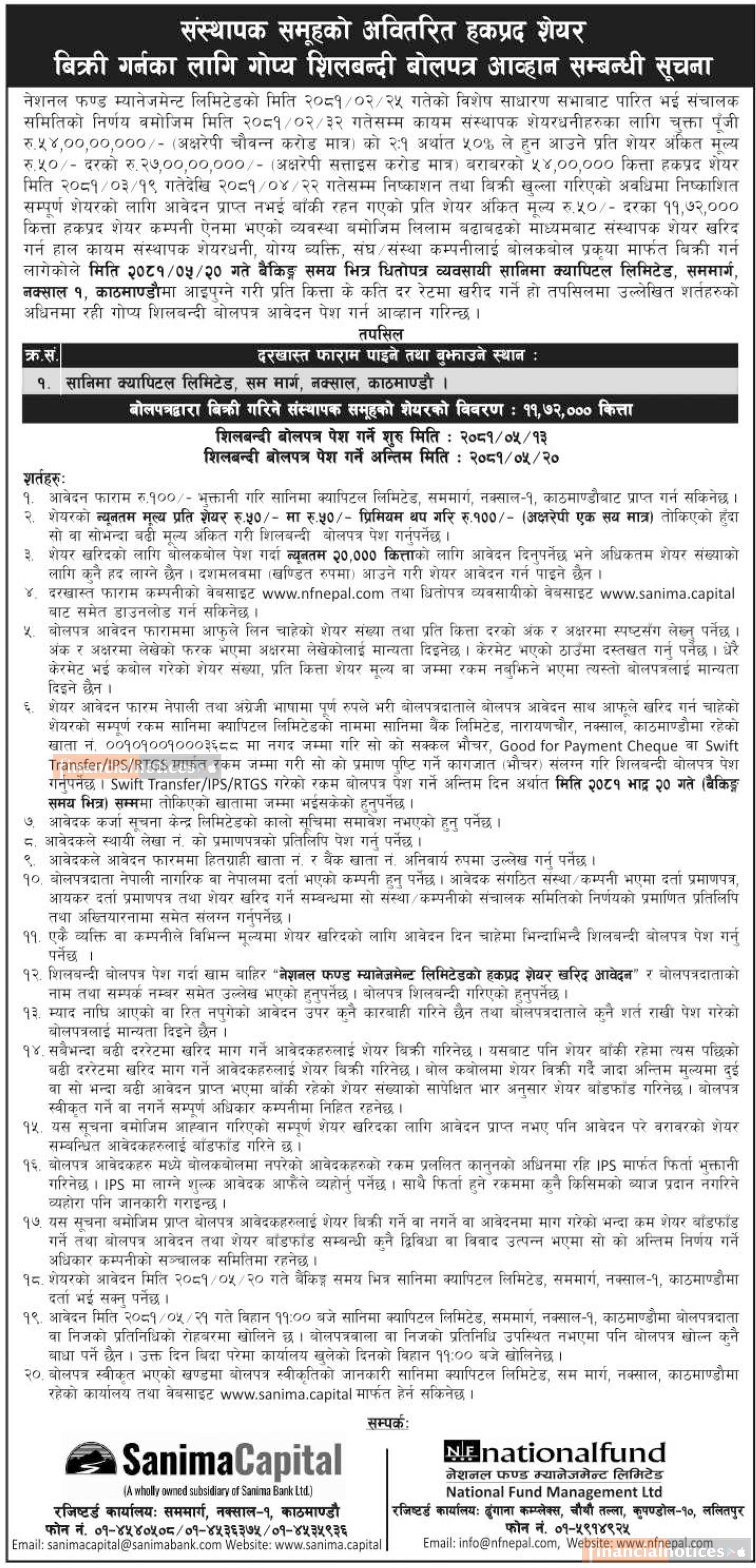 National Fund Management Auctioning 11,72,000 Promoter Shares to the promoter shareholders