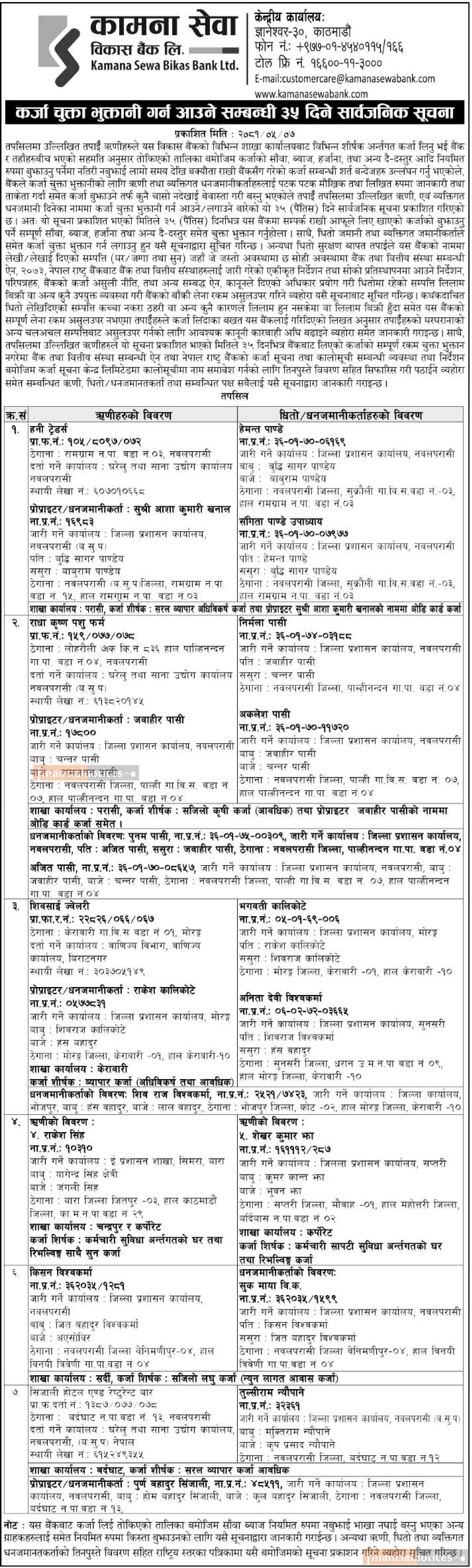 कर्जा चुक्ता भुक्तानी गर्न आउने सम्बन्धी ३५ दिने सार्वजनिक सूचना