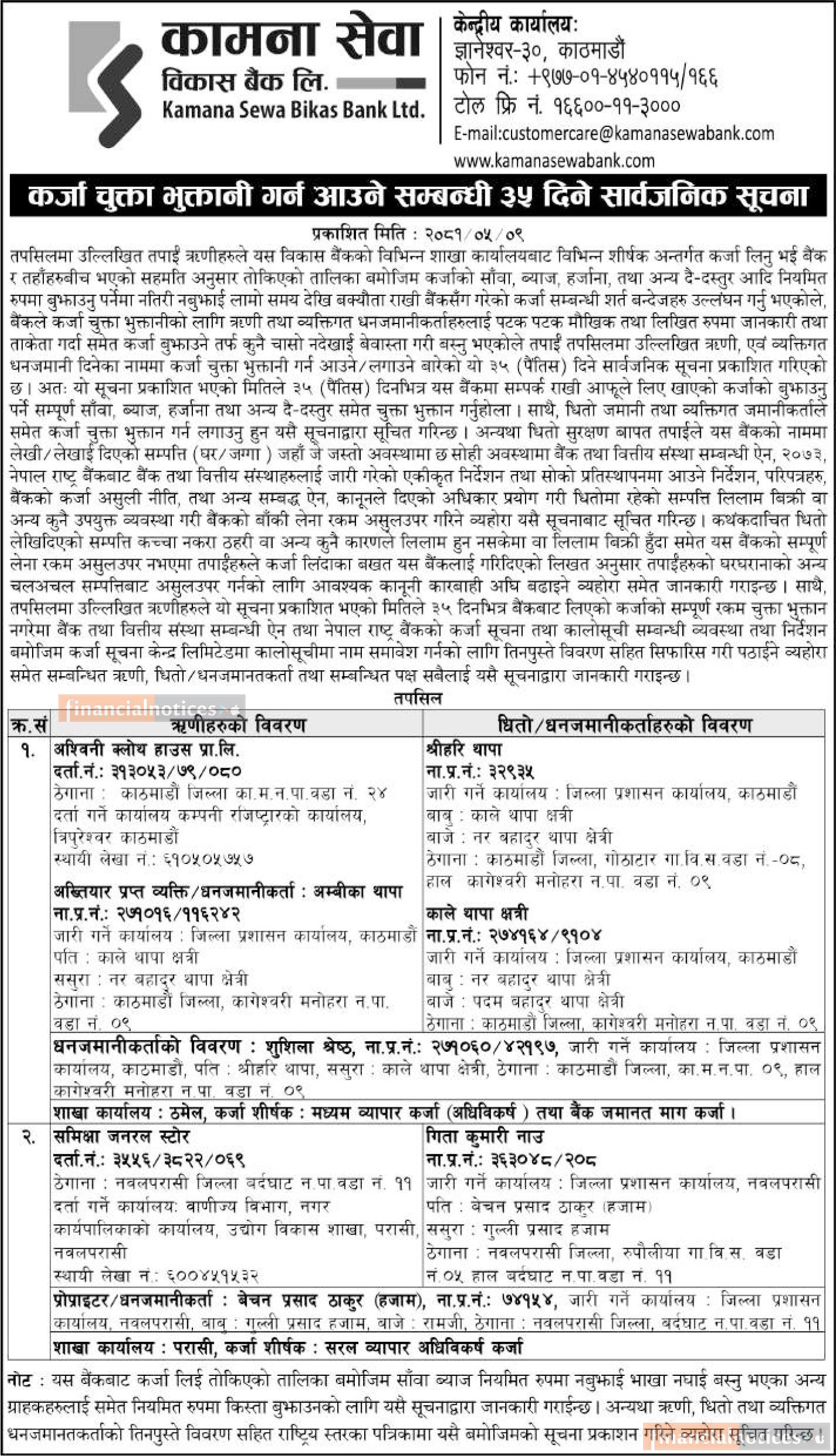 कर्जा चुक्ता भुक्तानी गर्न आउने सम्बन्धी ३५ दिने सार्वजनिक सूचना -