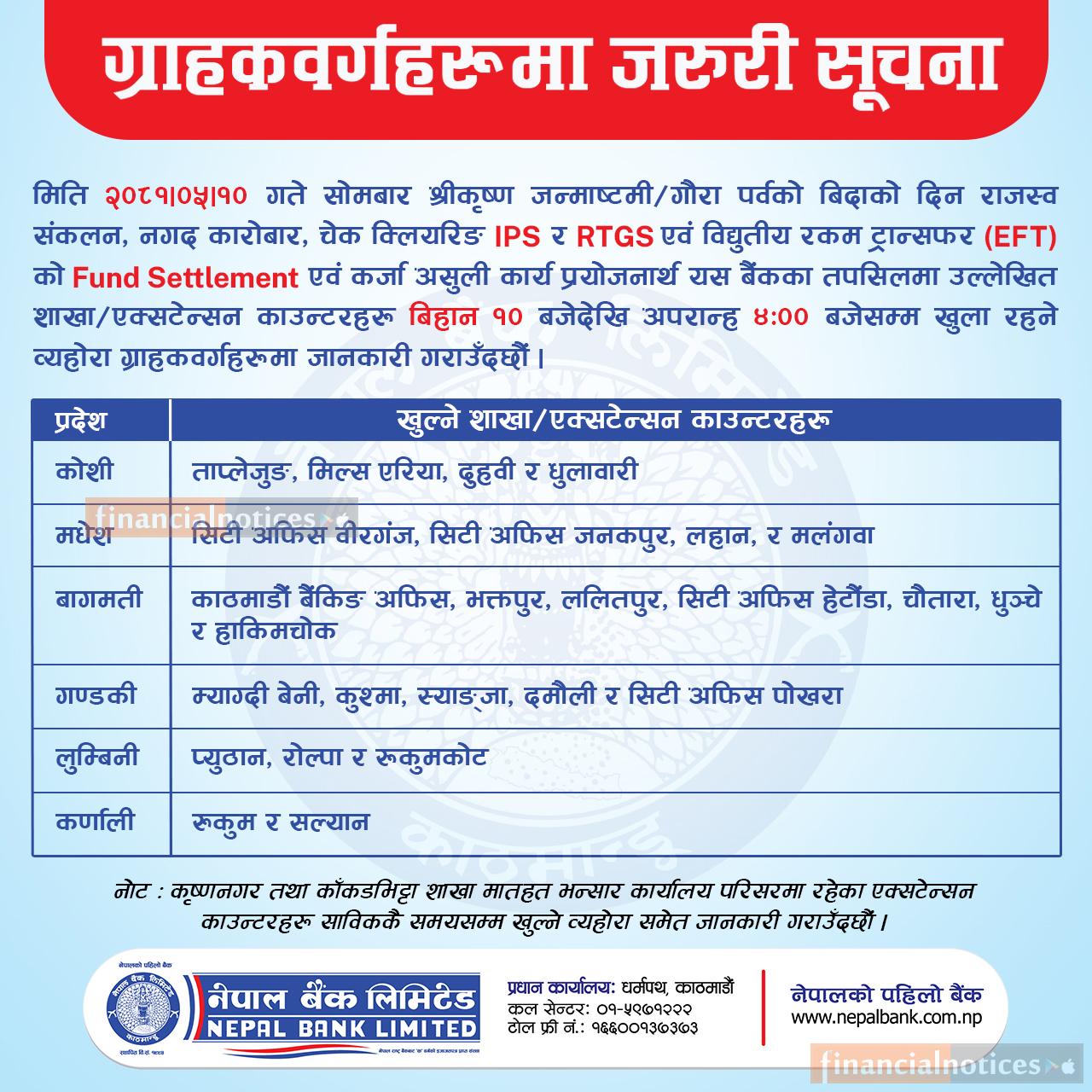 Kathmandu, Nepal – In a move to provide uninterrupted banking services to its customers, Nepal Bank Limited has announced that select branches will remain open during the upcoming public holidays of Shree Krishna Janmashtami and Gaura Parva.