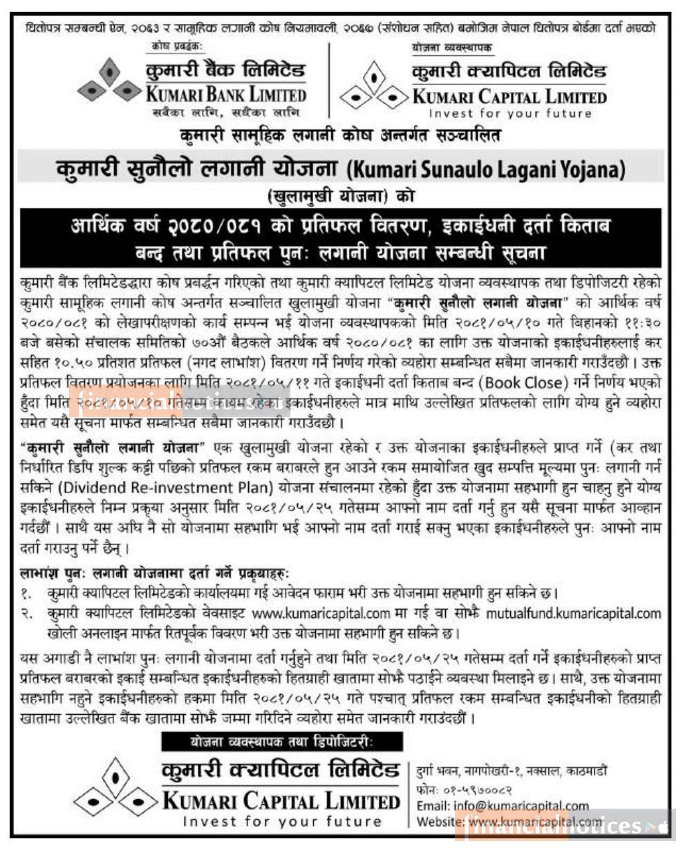 कुमारी सुनौलो लगानी योजनाको प्रतिफल विवरण, इकाइधनी दर्ता किताब बन्द तथा प्रतिफल पुन लगानी योजनाबारे सूचना