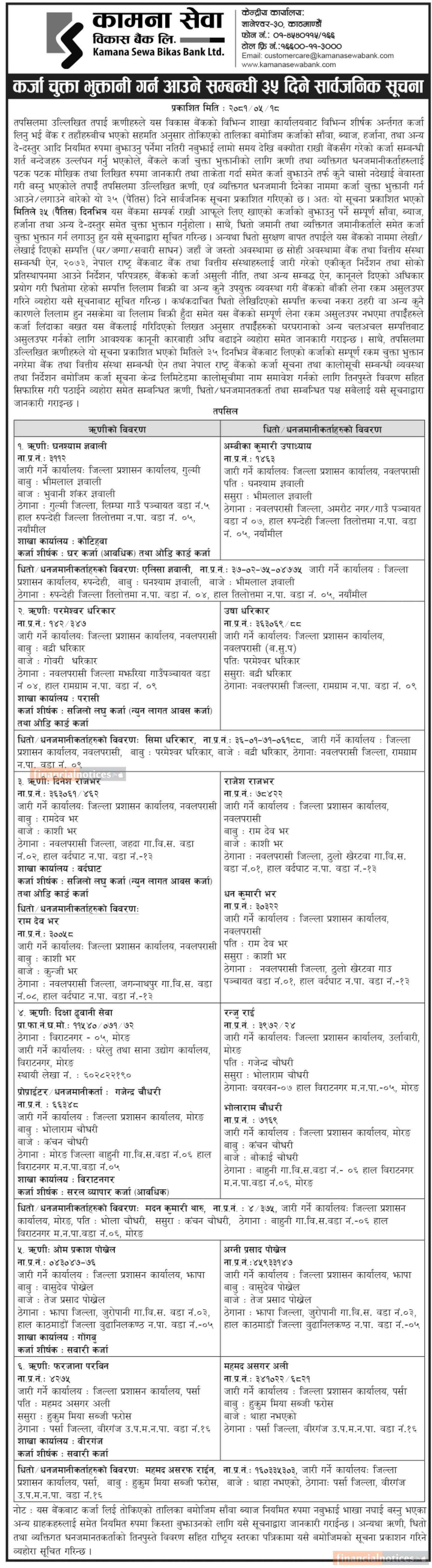 कर्जा चुक्ता भुक्तानी गर्न आउने सम्बन्धी ३५ दिने सार्वजनिक सूचना -