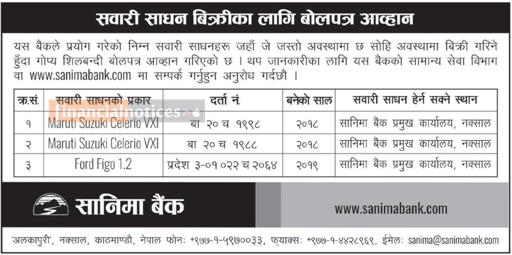Notice for Vehicle Sale by Sealed Bid Invitation from Sanima Bank
