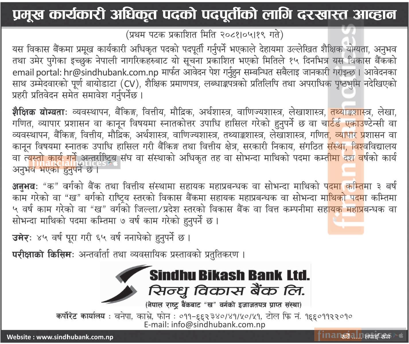 सिन्धु विकास बैंकमा रोजगारीको अवसर