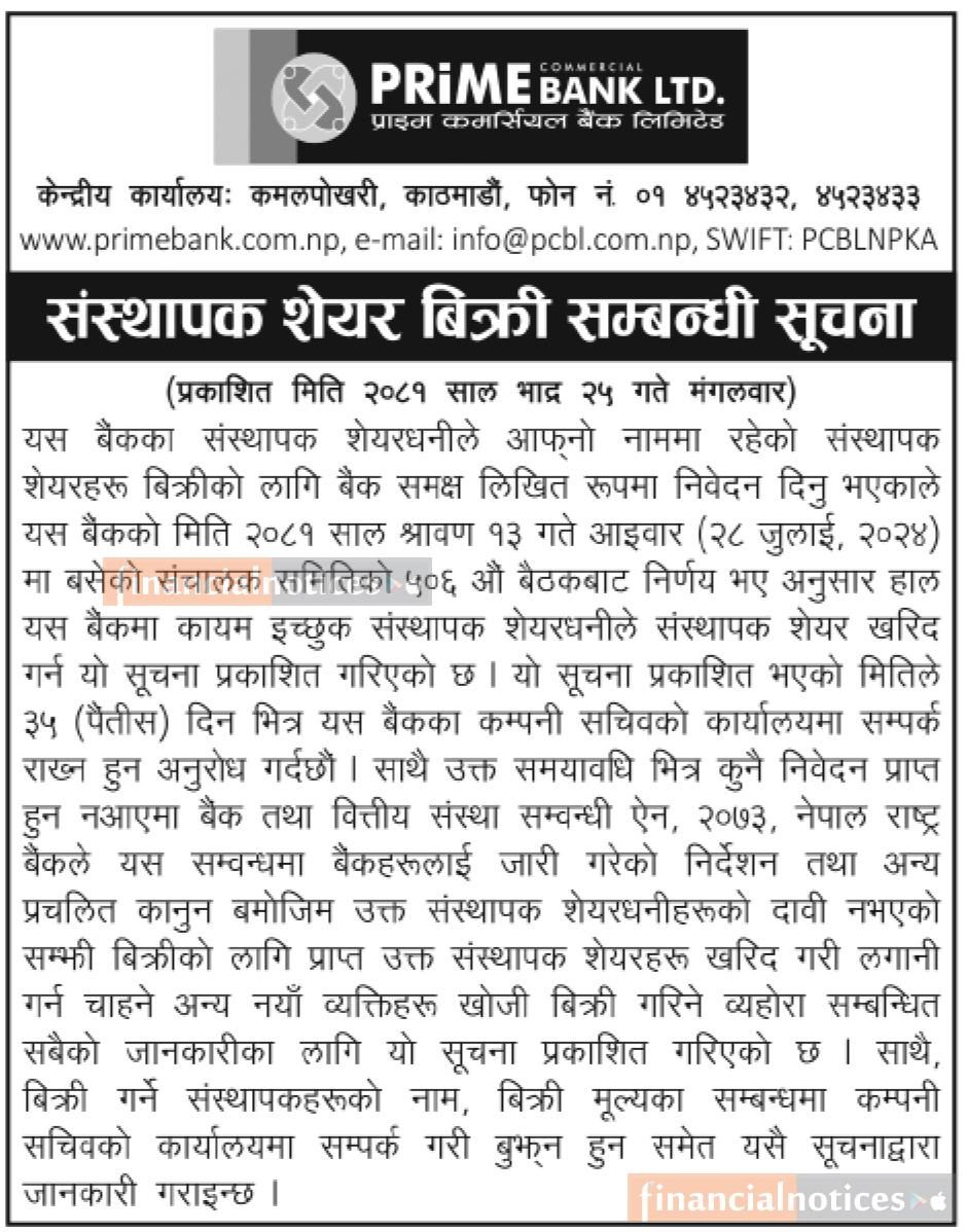 संस्थापक शेयर बिक्री सम्बन्धी ३५ दिने सूचना
