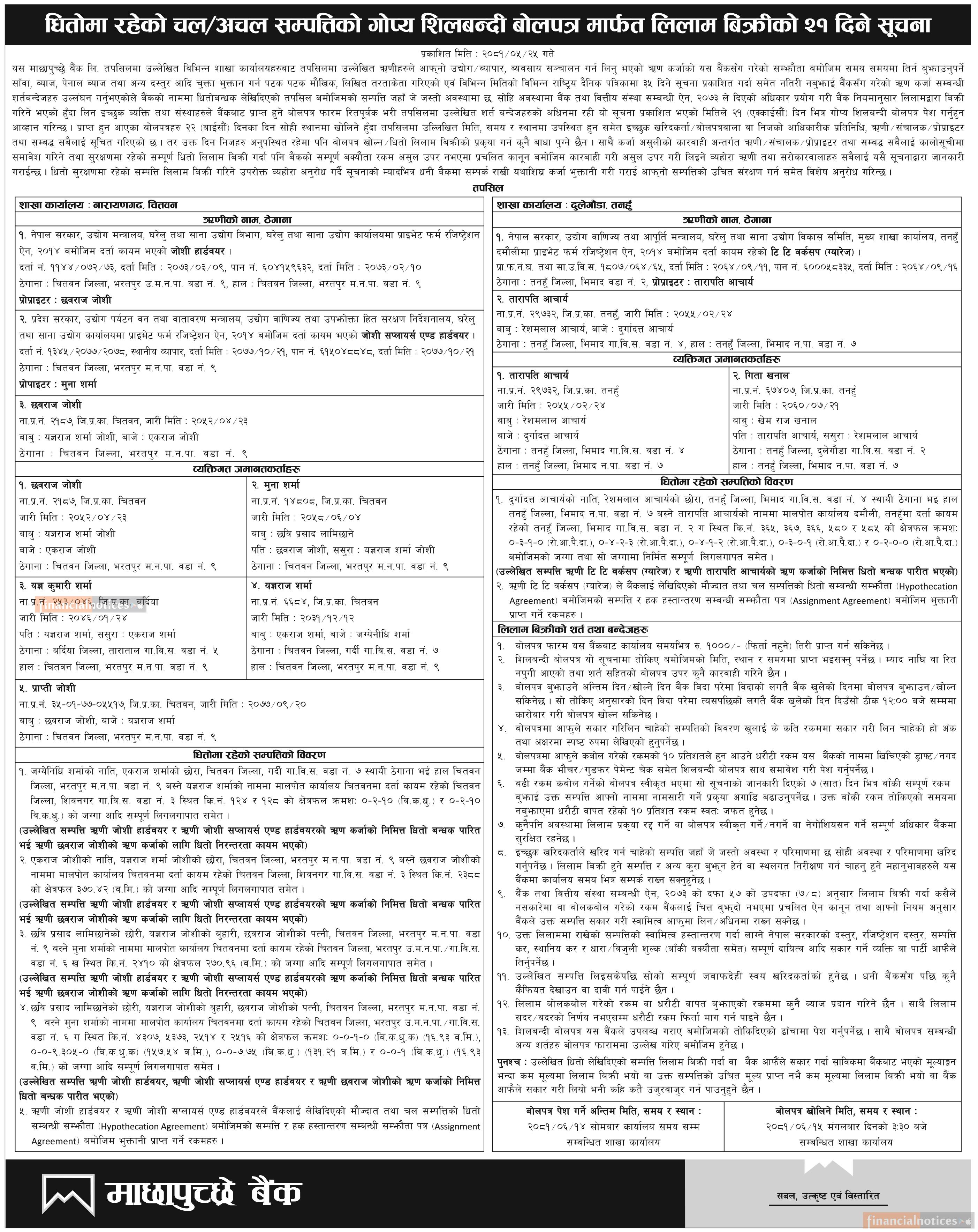धितोमा रहेको चल अचल सम्पत्तिको गोप्य शिलबन्दी बोलपत्र मार्फत लिलाम बिक्रीको २१ दिने सूचना