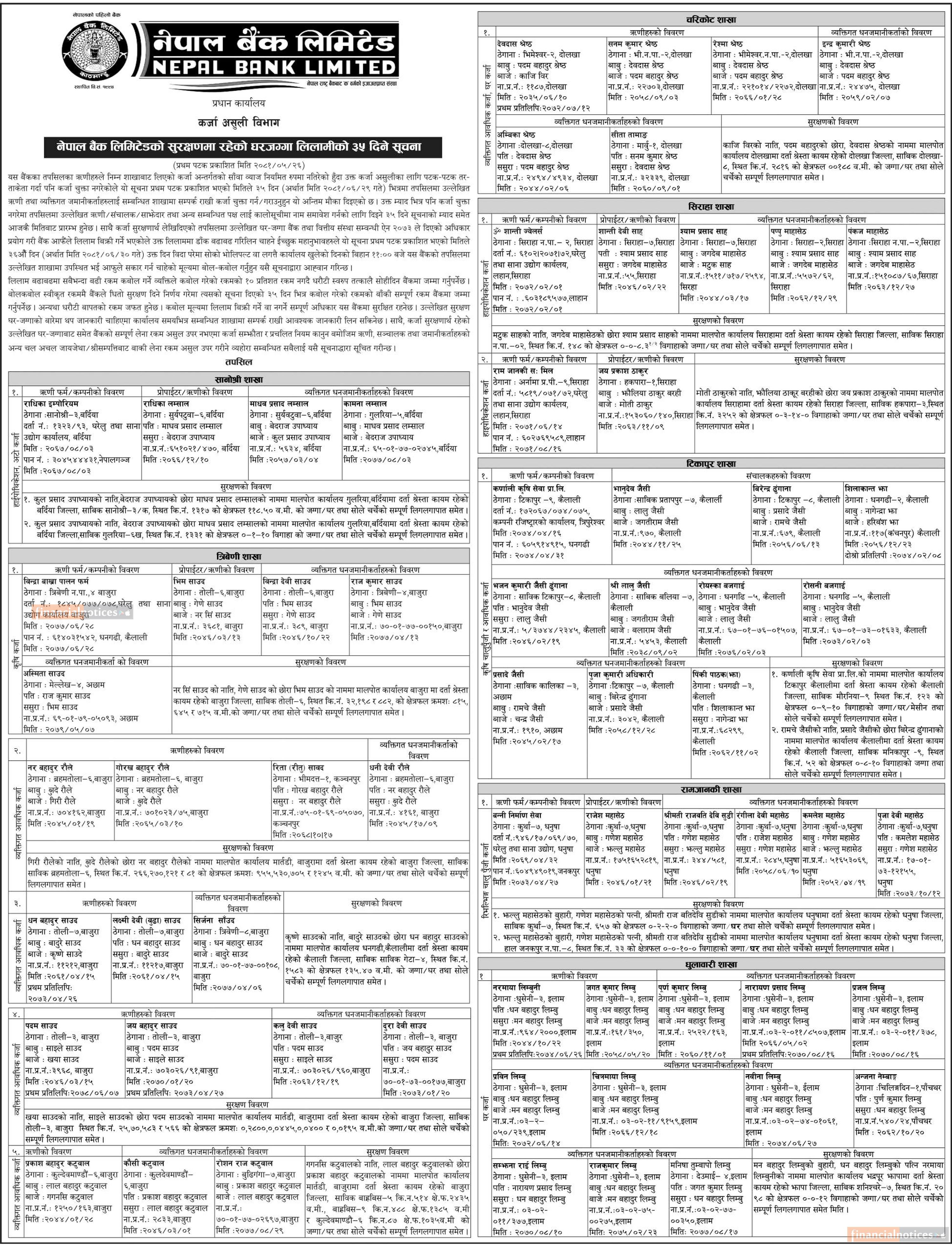 नेपाल बैंकको सुरक्षणमा रहेको घरजग्गा लिलामीको ३५ दिने सूचना