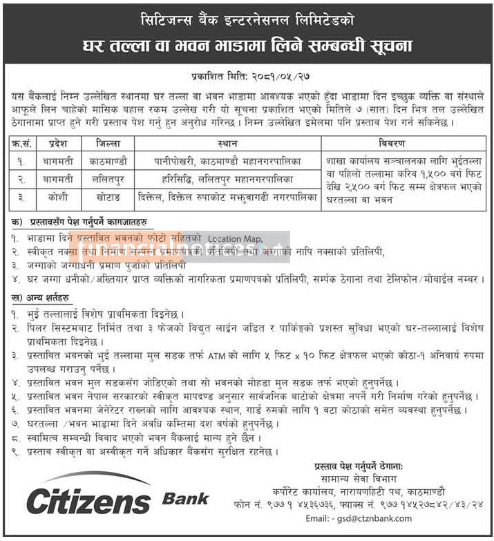 सिटिजन्स बैंकलाई घर तल्ला वा भवन आवश्यकता सम्बन्धी सूचना