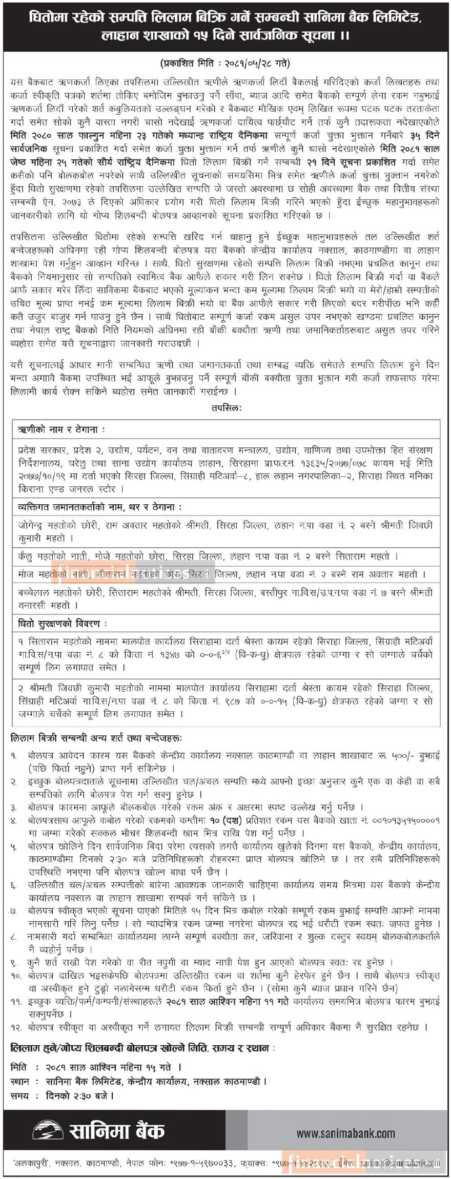 धितोमा रहेको सम्पत्ति लिलाम बिक्री गर्ने सम्बन्धी लहान शाखाको १५ दिने सार्वजनिक सूचना
