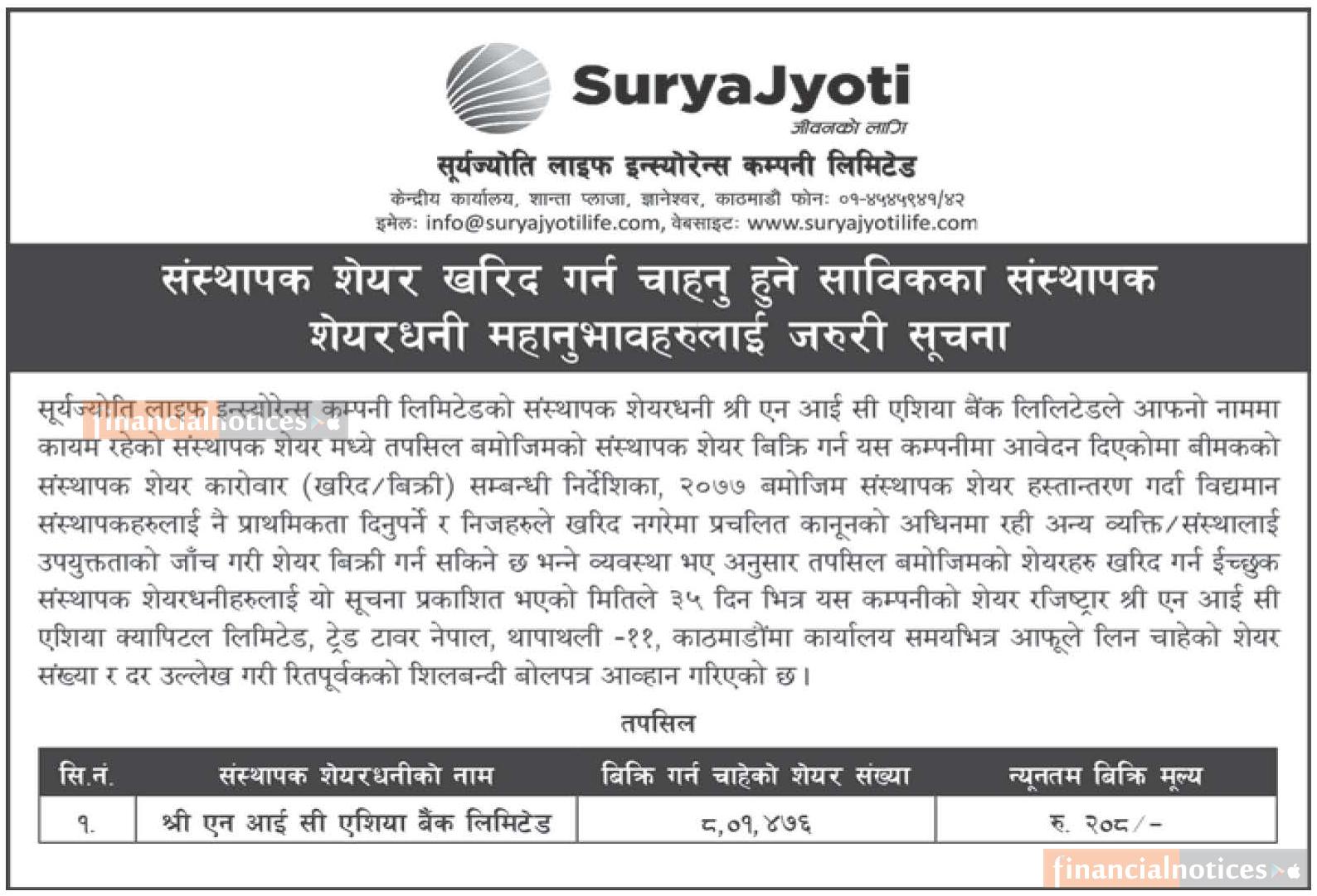 संस्थापक शेयर बिक्री सम्बन्धी ३५ दिने सूचना