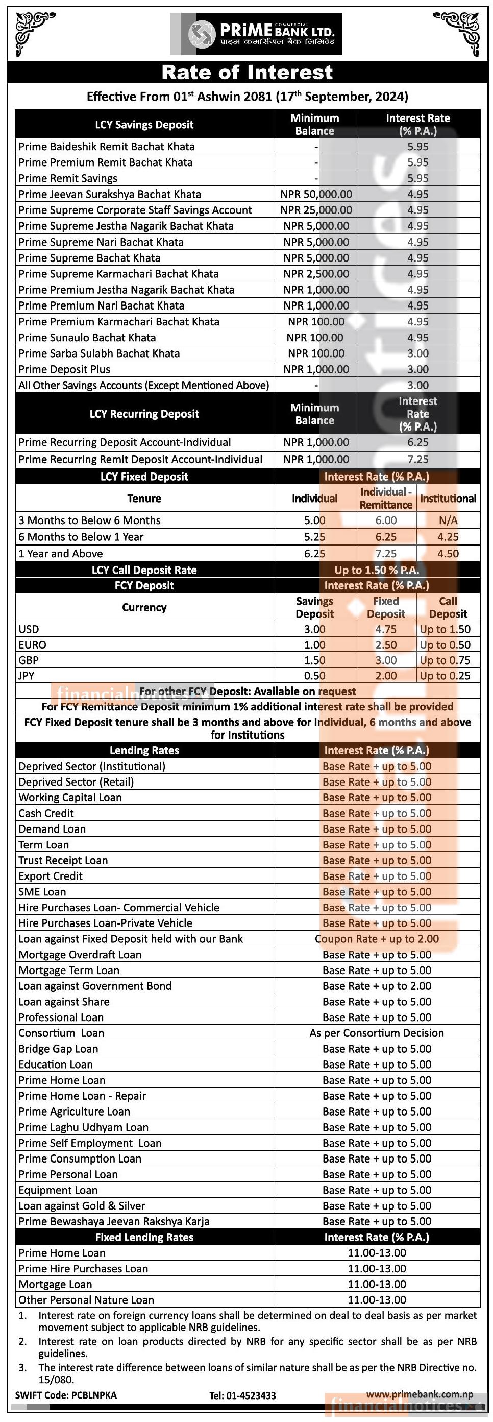 असोज एक गतेदेखि लागुहुने गरी प्राइम बैंकको नयाँ ब्याजदर सार्वजनिक