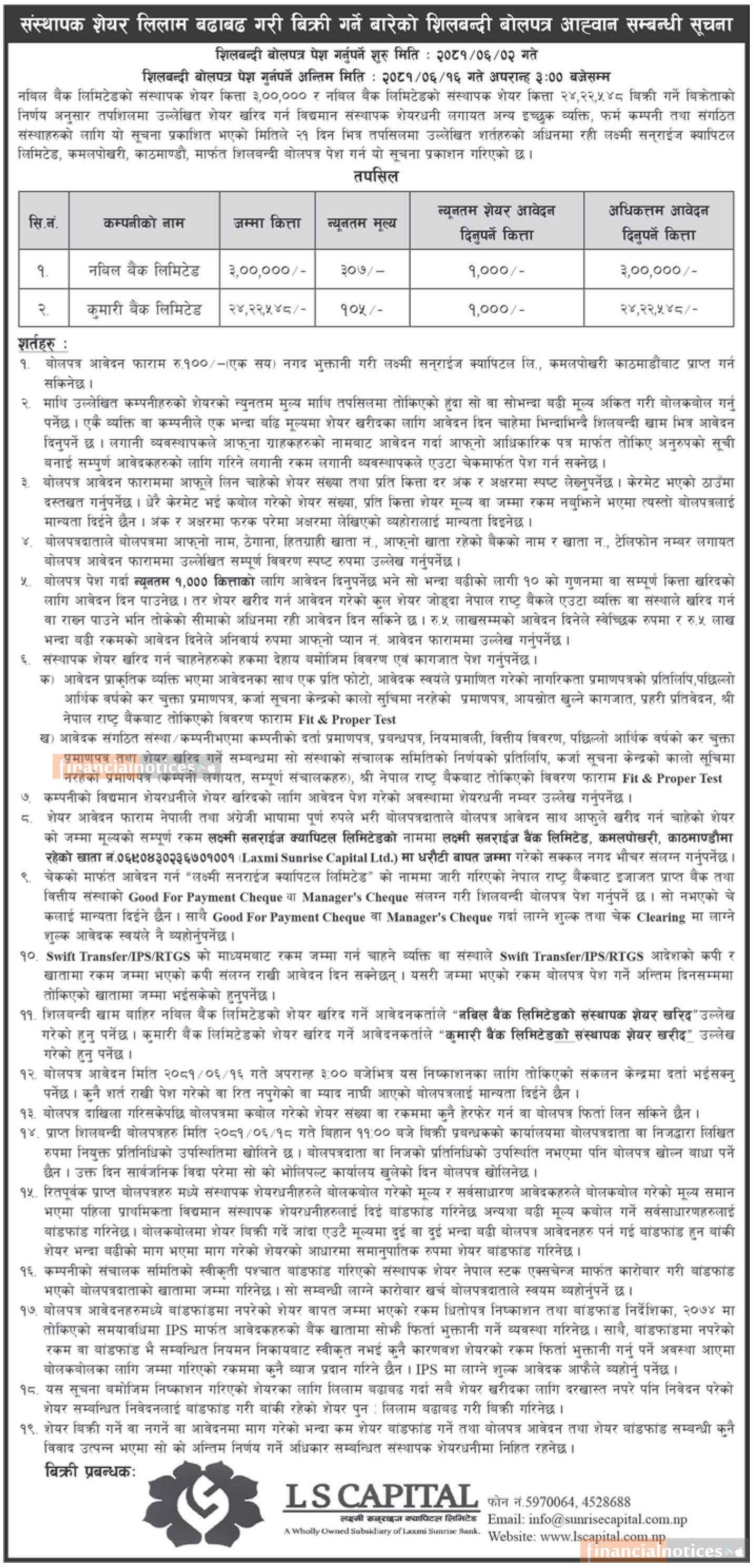 नविलको ३ लाख कित्ता र कमारी बैंकको २ लाख कित्ता संस्थापक शेयर लिलाम बिक्री सम्बन्धी सूचना