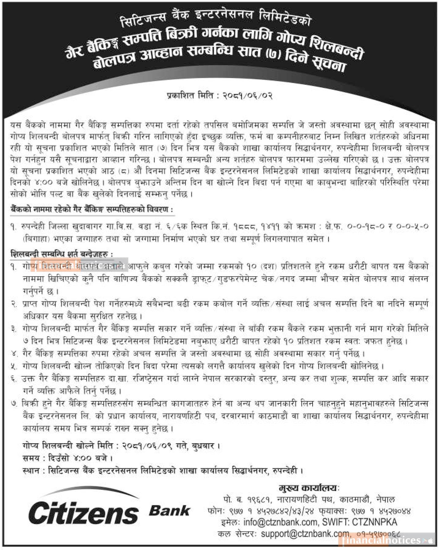 गैह्र बैंकिङ्ग सम्पत्ति बिक्री गर्नका लागि गोप्य शिलबन्दी बोलपत्र आव्हान सम्बन्धी ७ दिने सूचना