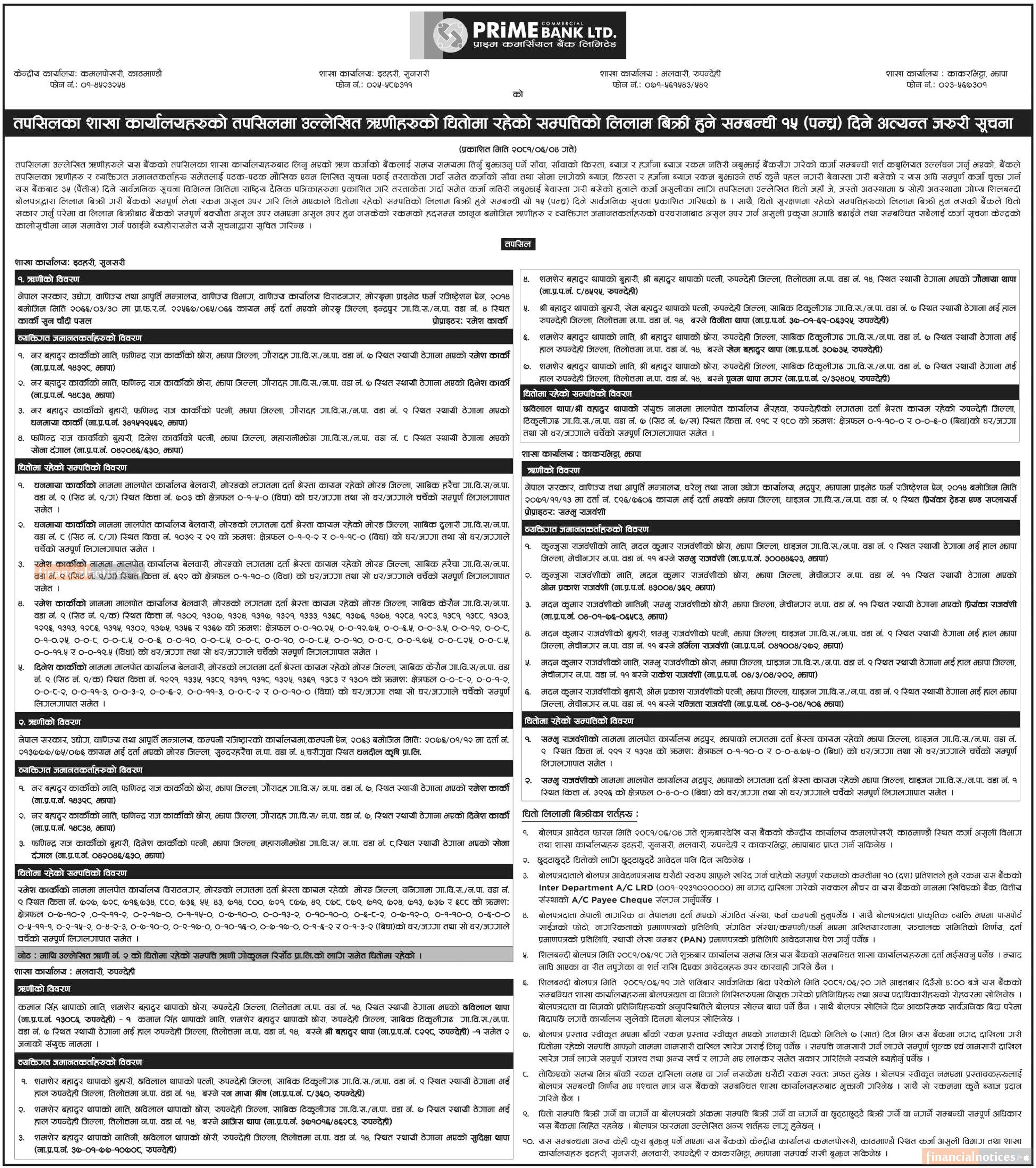 ऋणीहरुको धितोमा रहेको सम्पत्तिको लिलाम बिक्री हुने सम्बन्धी १५ दिने जरुरी सूचना