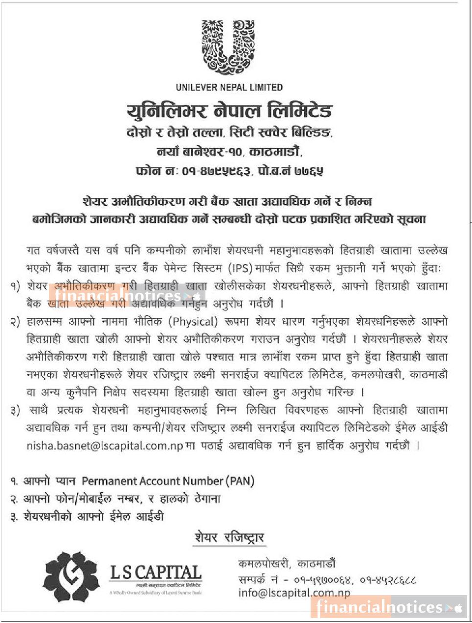 शेयर अभौतिकिकरण गरी बैक खाता अद्यावधिक गर्ने बारे सूचना
