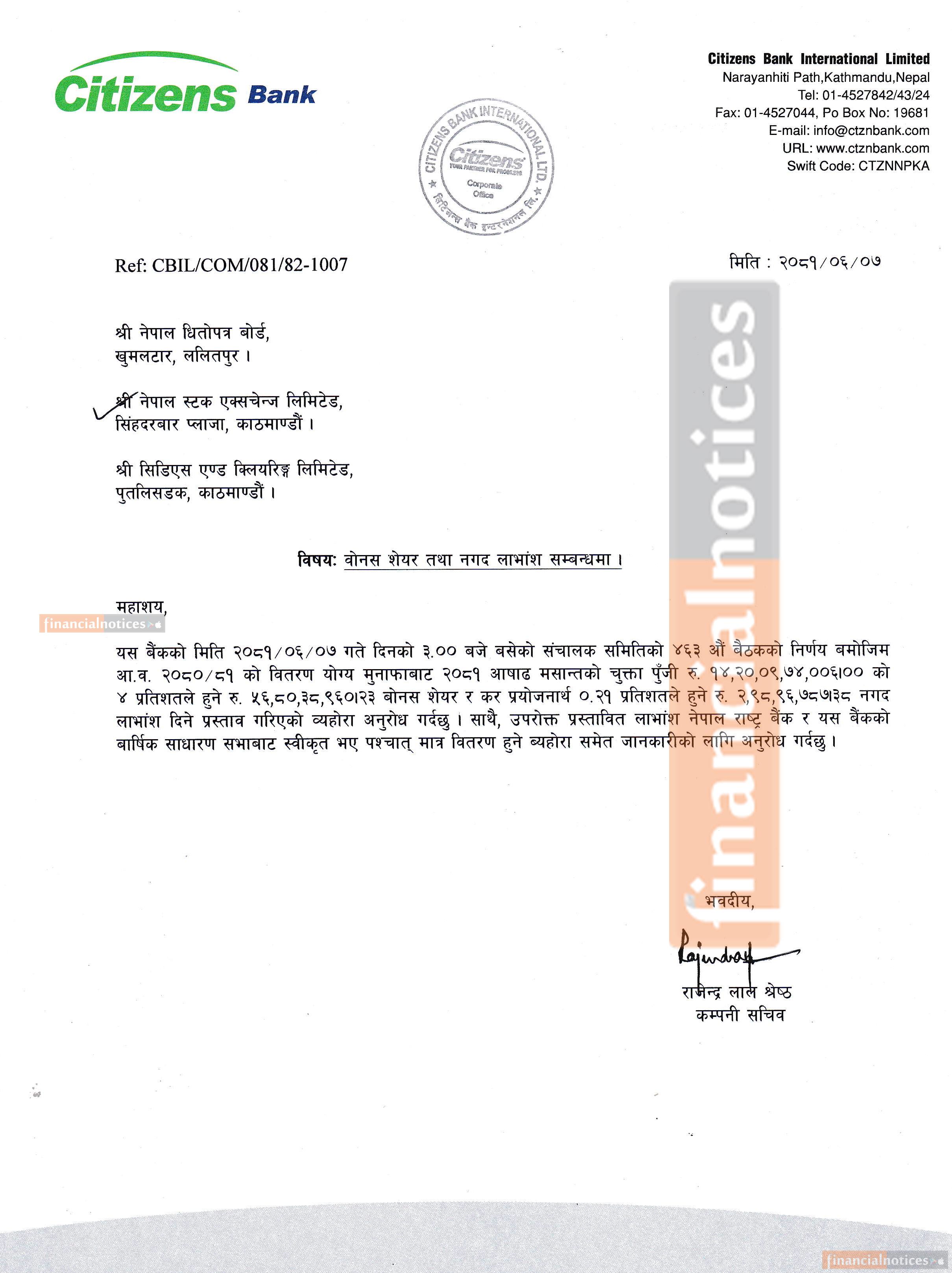 सिटिजन्स बैंकको लाभांश घोषणा सम्बन्धी सूचना, बोनस कति ?
