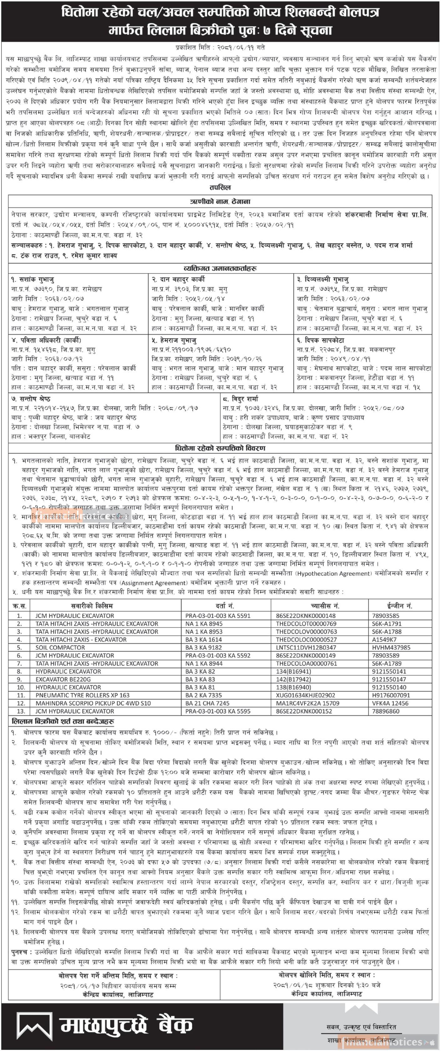 धितोमा रहेको चल अचल सम्पत्तिको गोप्य शिलबन्दी बोलपत्र मार्फत लिलाम बिक्रीको पुनः ७ दिने सूचना