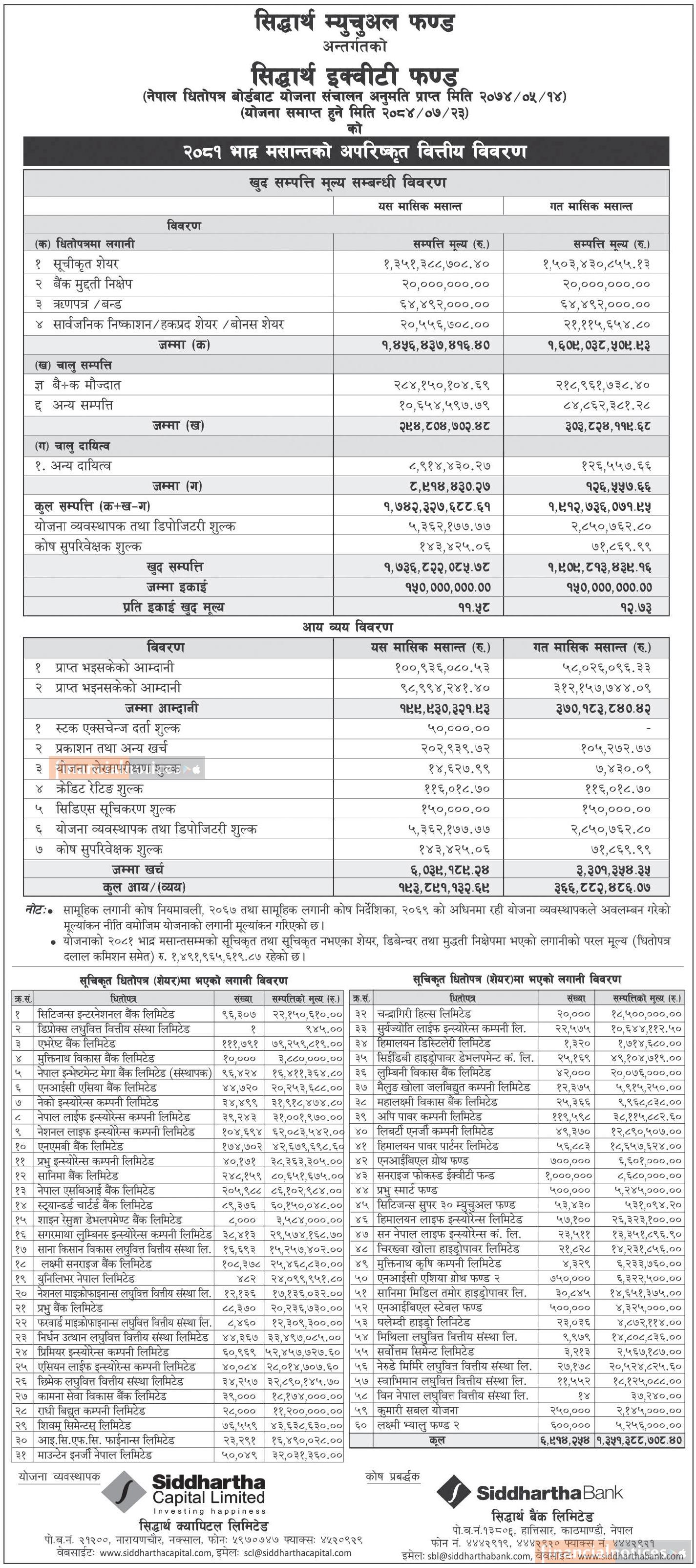 Siddhartha Capital has published Siddhartha Equity Fund NAV till Bhadra, 2081