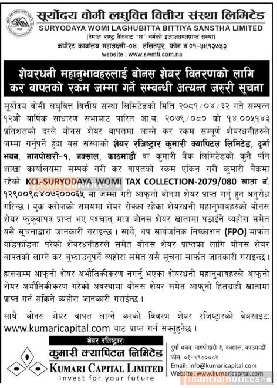 बोनस शेयर वितरणको लागि कर बापतको रकम जम्मा गर्ने सम्बन्धी सूचना