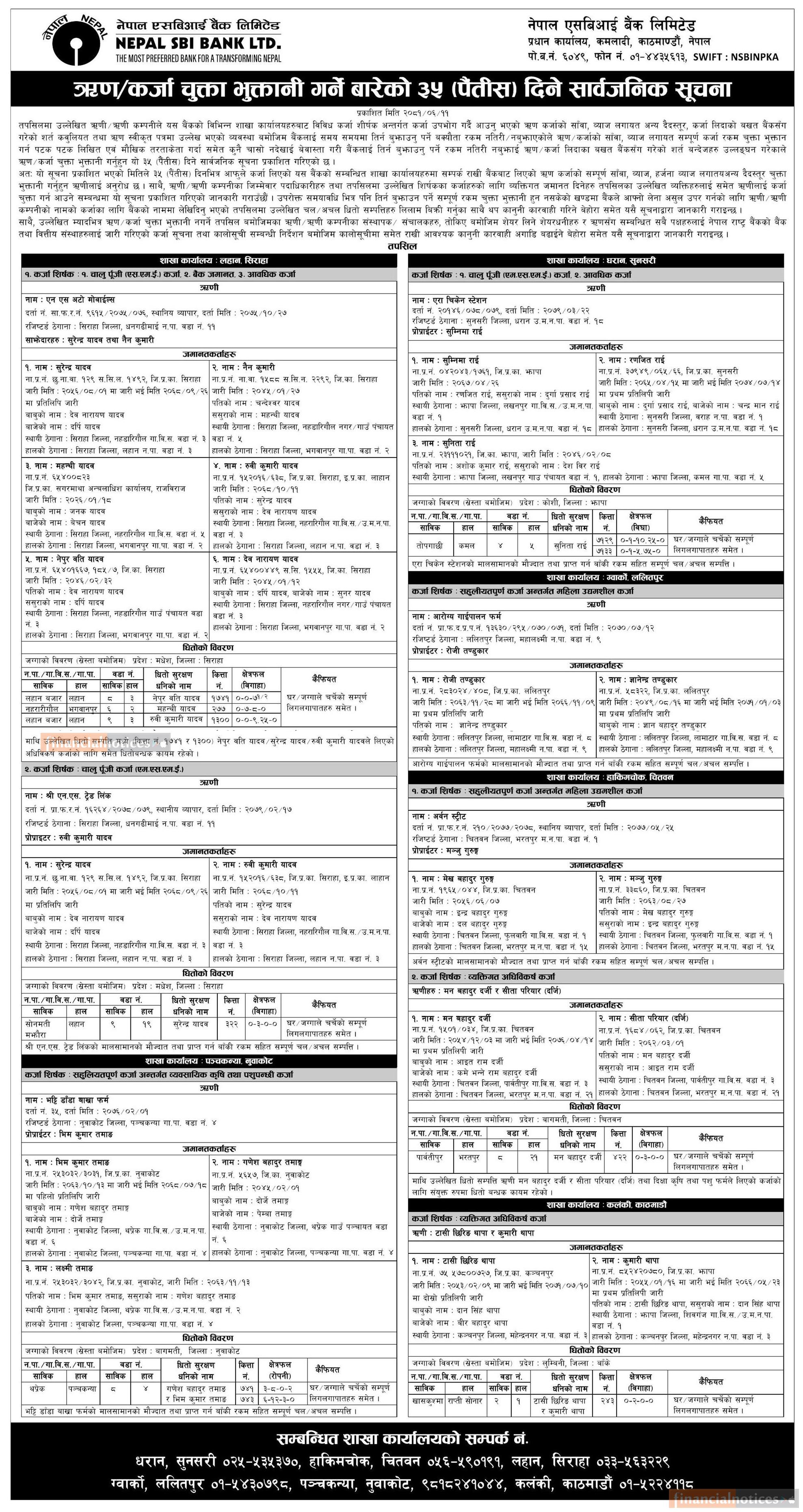 ऋण कर्जा चुक्ता भुक्तान गर्ने बारे नेपाल एसबिआई बैंकको ३५ दिने सार्वजनिक सूचना -