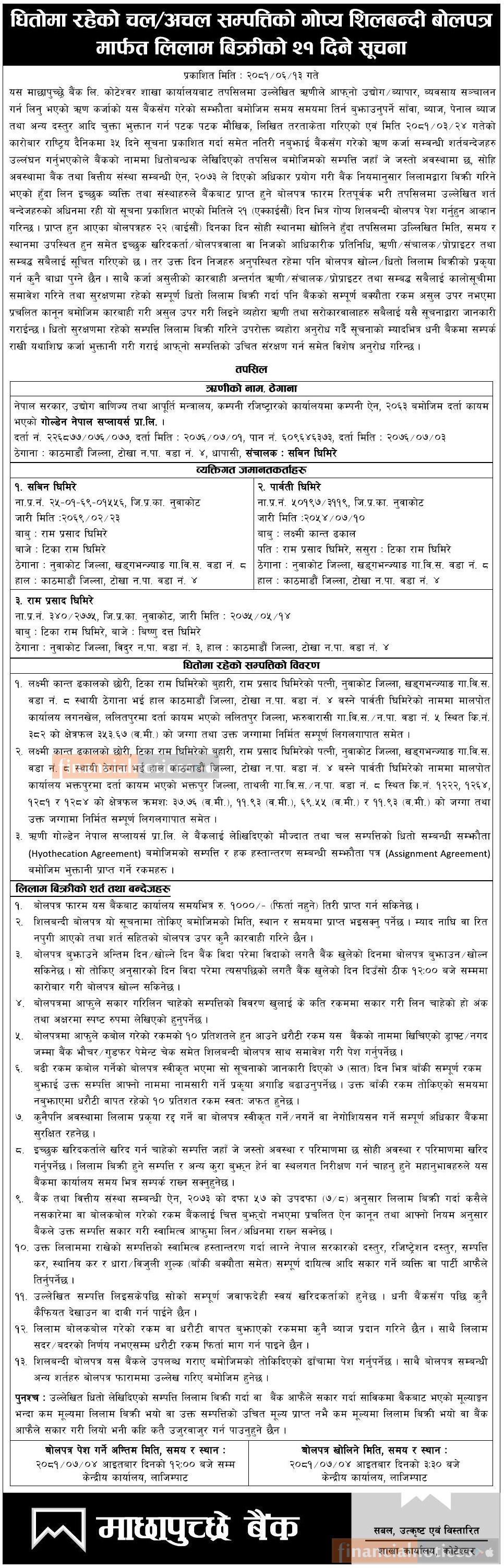 धितोमा रहेको चल अचल सम्पत्तिको गोप्य शिलबन्दी बोलपत्र मार्फत लिलाम बिक्रीको २१ दिने सूचना