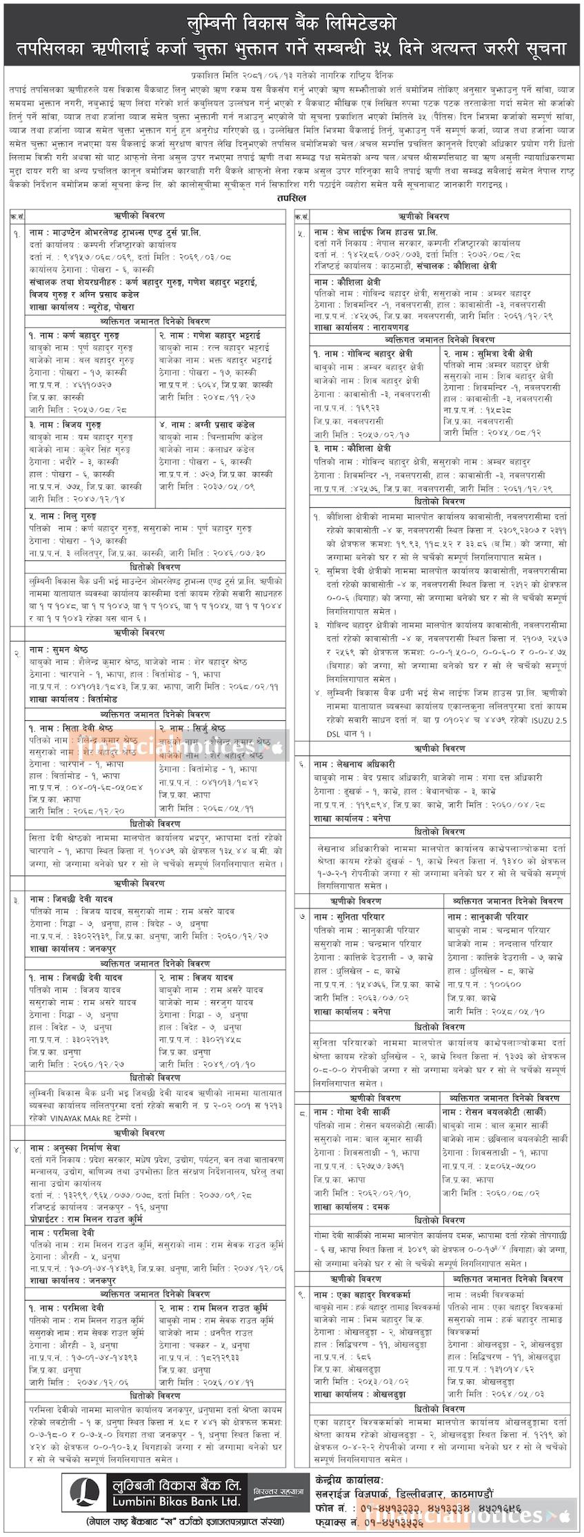 तपसिलका ऋणीहरुलाई कर्जा चुक्ता भुक्तान गर्ने सम्बन्धी ३५ दिने अत्यन्त जरुरी सूचना