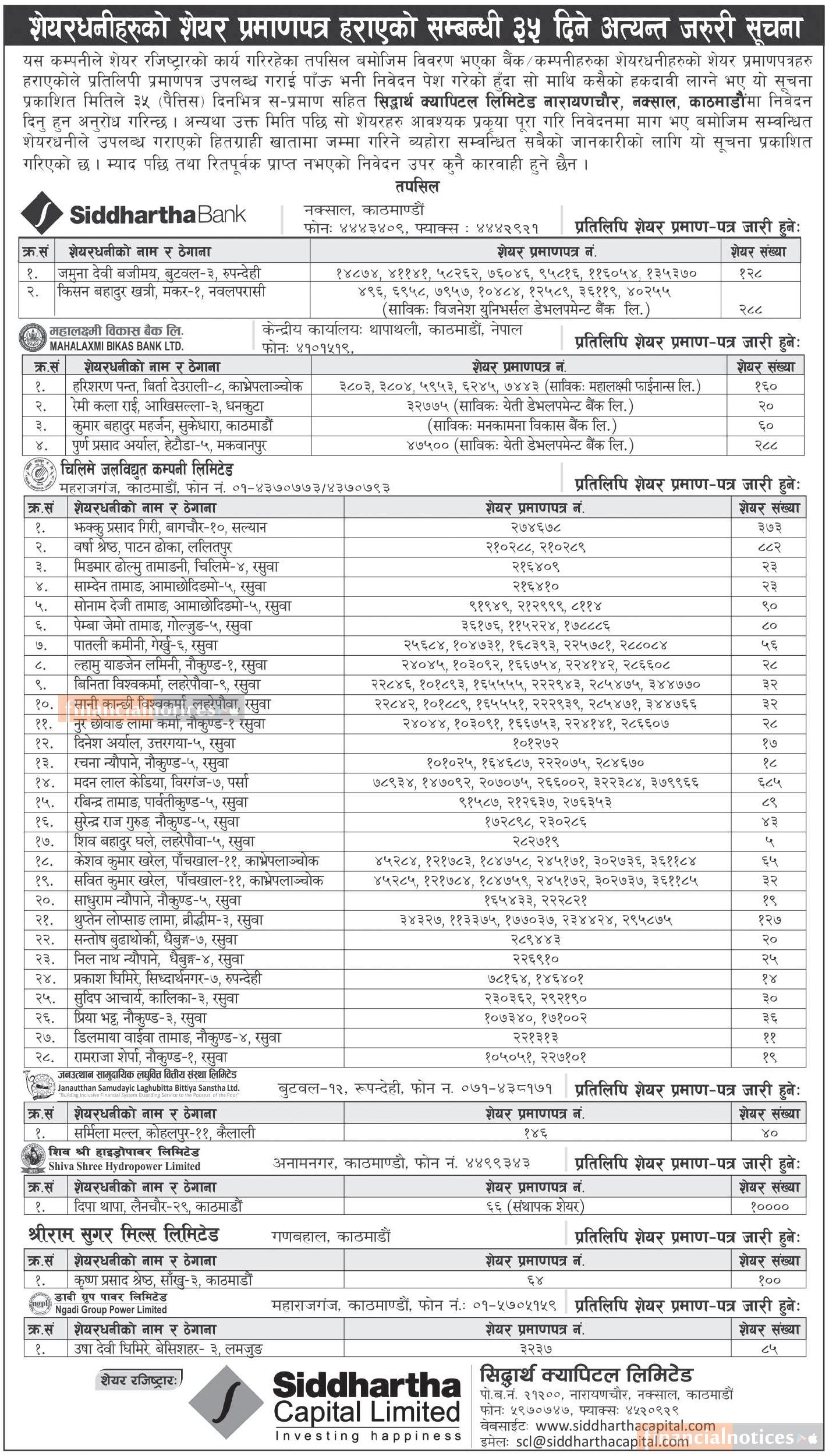 शेयरधनीहरुको शेयर प्रमाणपत्र हराएको सम्बन्धी ३५ दिने सूचना -