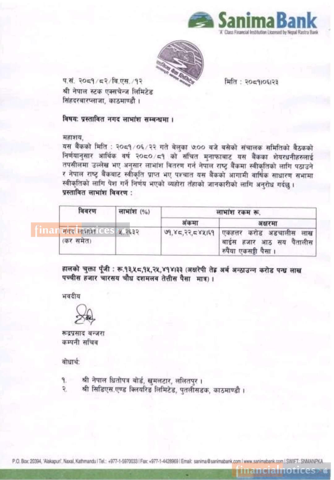 सानिमा बैंकको नगद लाभांश घोषणा सम्बन्धी सूचना