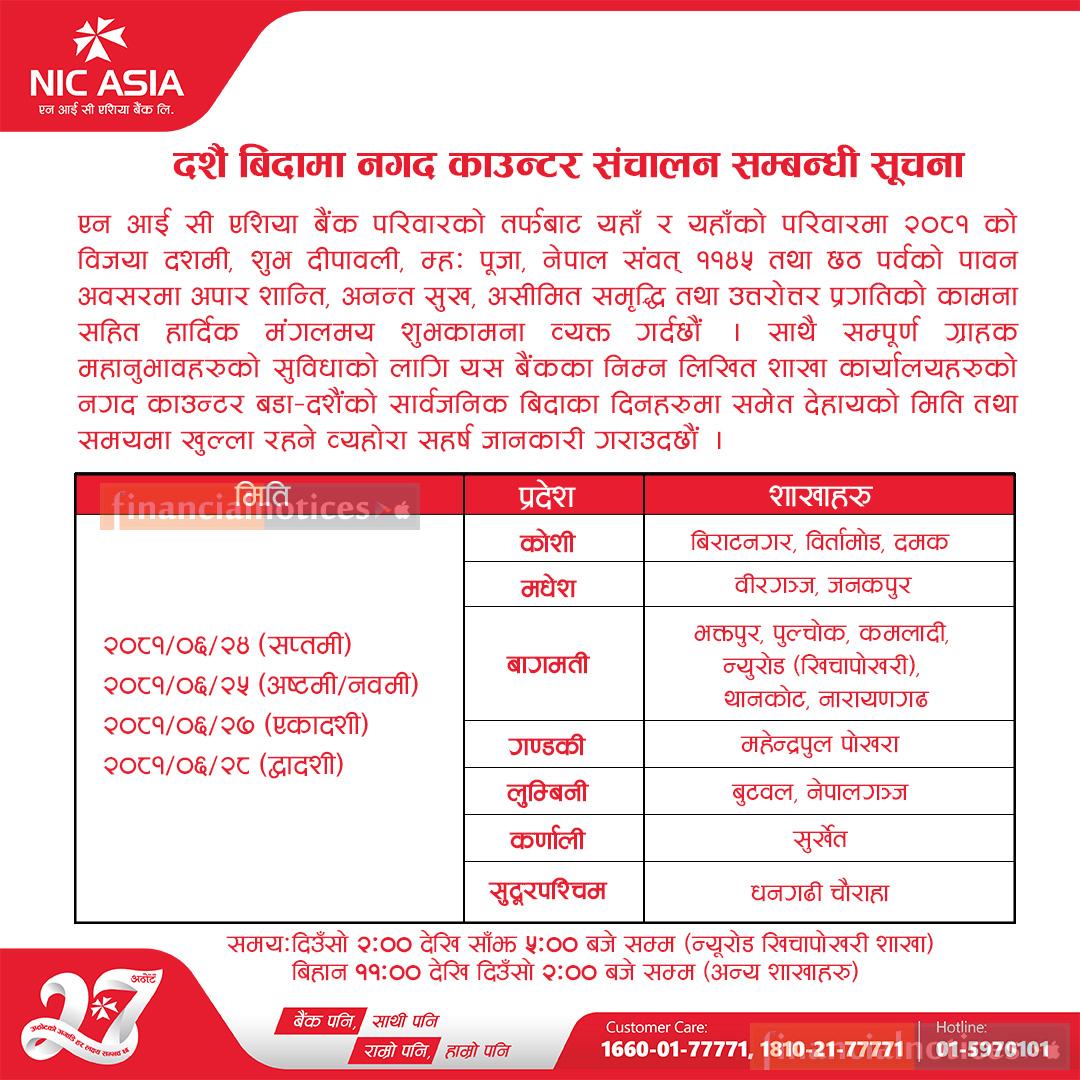 एनआइसी एशिया बैंकको दसैँमा खुल्ले शाखाबारे सूचना - Banking Hours -