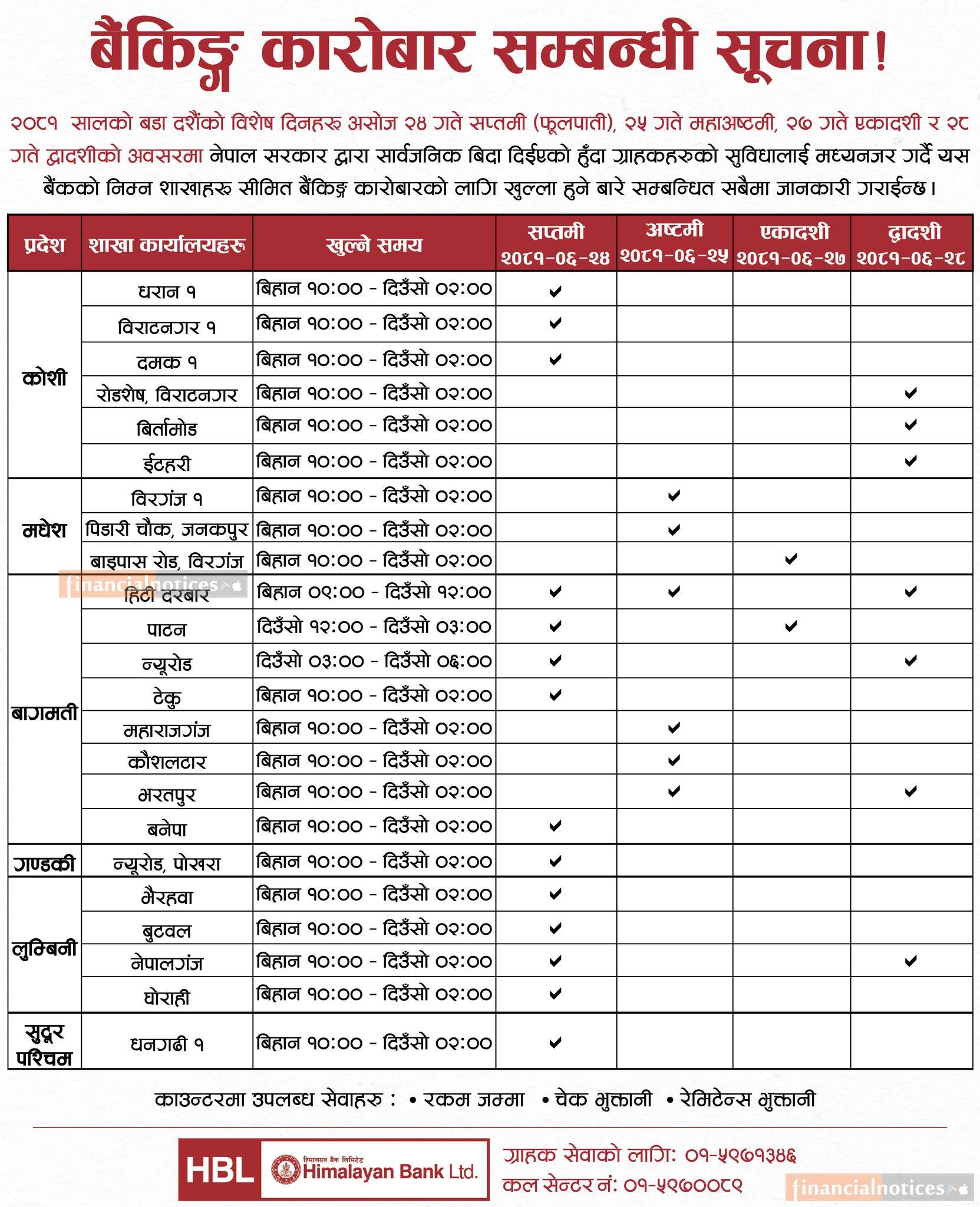 हिमालयन बैंकको शाखा समयबारे नयाँ जानकारी - Dashain Banking Hours -