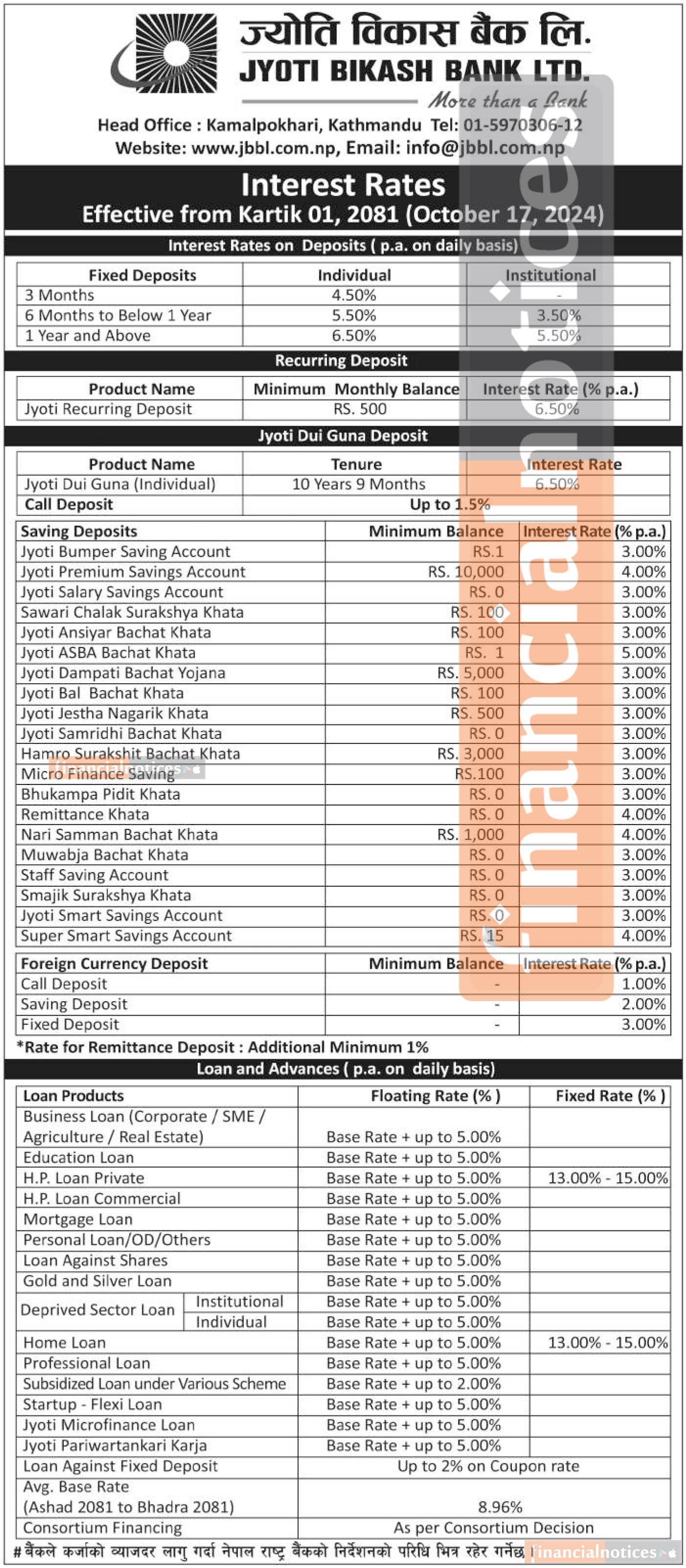 ज्योति विकास बैंकको नयाँ ब्यजदर सर्वजनिक - Interest Rate -