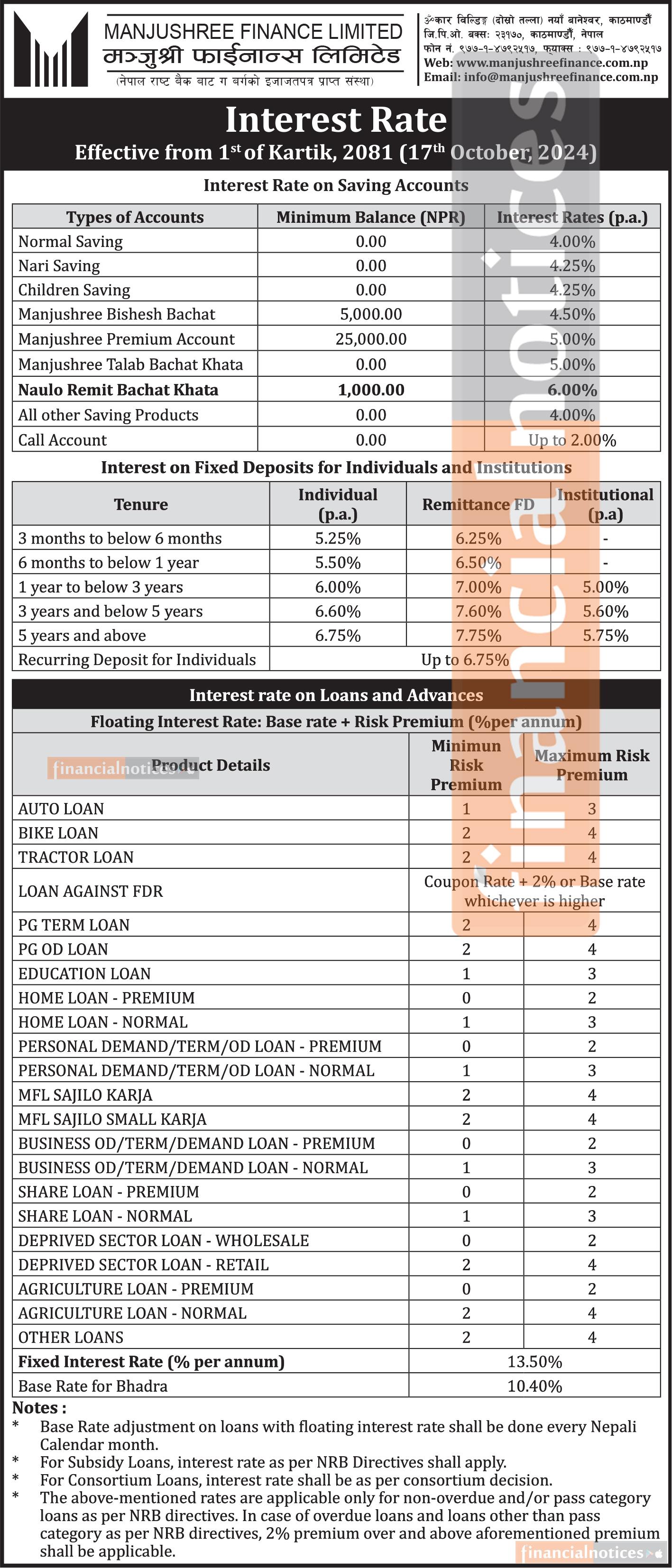 Manjushree Finance Announces New Interest Rates Effective 1st Kartik, 2081