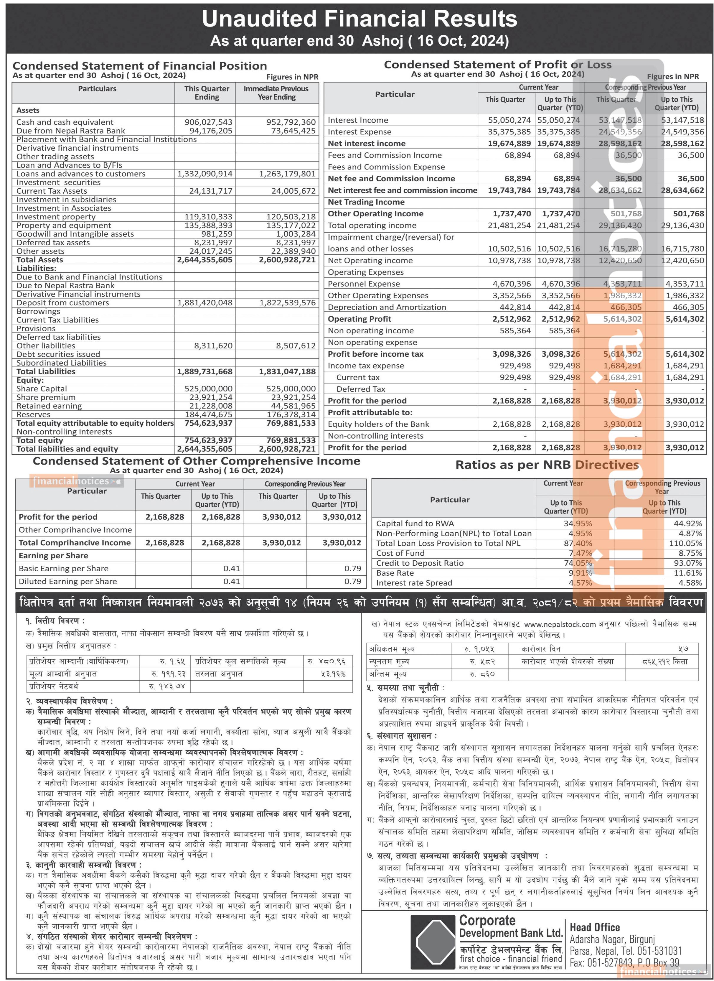 कर्पोरेट डेभलपमेन्ट बैंकको पहिलो त्रैमासमा खुद घाटा २१ लाख ६८ हजार रुपैयाँ