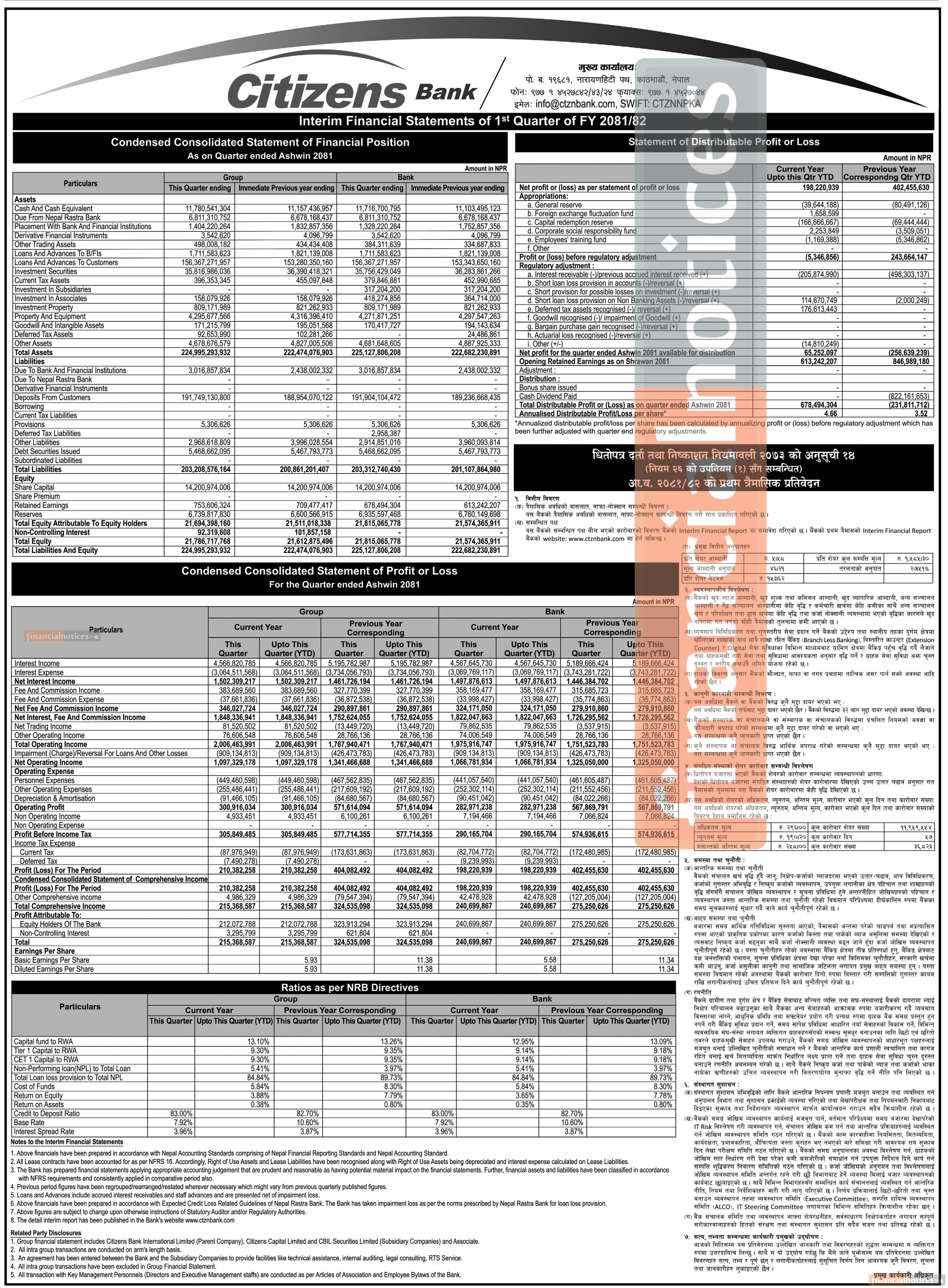 सिटिजन्स बैंकले चालु आर्थिक वर्षको पहिलो त्रैमासको अन्त्यसम्म १९ करोड ८२ लाख रुपैयाँ खुद नाफा आर्जन गरेको छ। यद्यपि, यो अघिल्लो वर्षको ४० करोड २४ लाख रुपैयाँको तुलनामा ५०.७५%ले घटेको छ। बैंकको खुद ब्याज आम्दानी ३.५६% ले बढेको छ, जुन सकारात्मक संकेत हो। हालको अवधि भित्र बैंकको सञ्चालन नाफा ५०.१७%ले घटेको छ, जसले कुल नाफामा कमी ल्याएको हो। बैंकको खराब कर्जा ५.४१६% पुगेको छ।