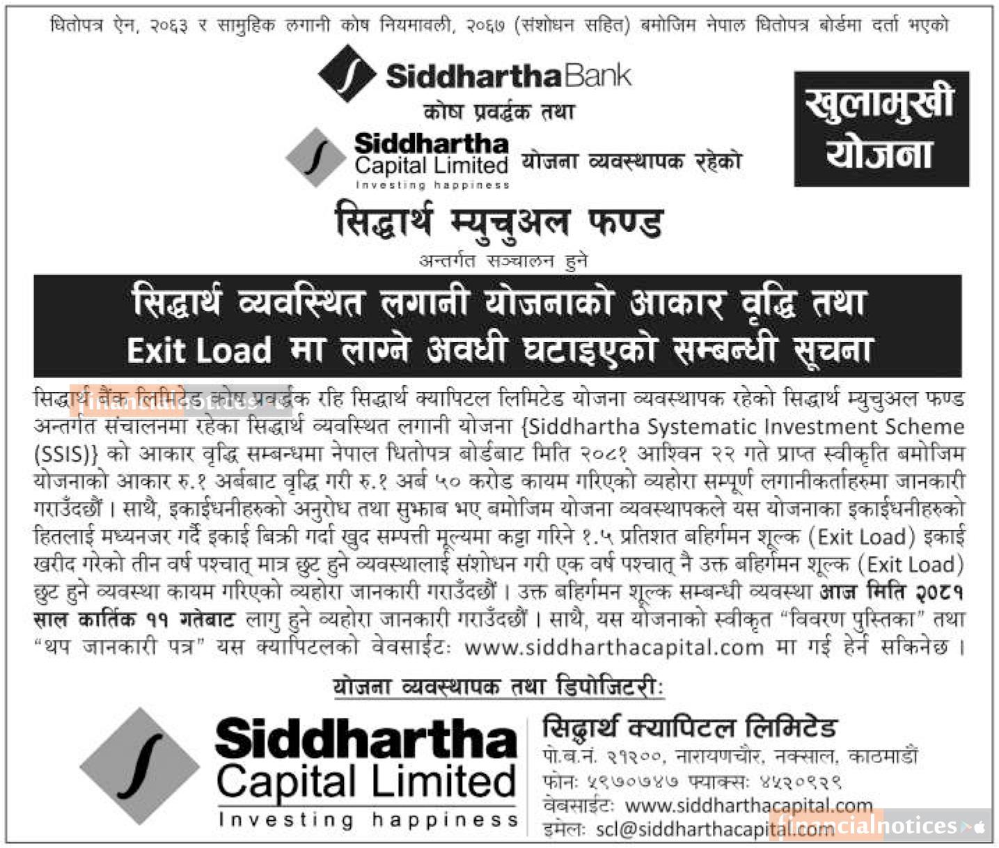 सिद्धार्थ भ्युचुवल फण्ड सिद्धार्थ व्यवस्थित लगानी योजनाको आकार वृद्धि तथा Exit Load मा लाग्ने अवधी घटाइएकोबारे सूचना