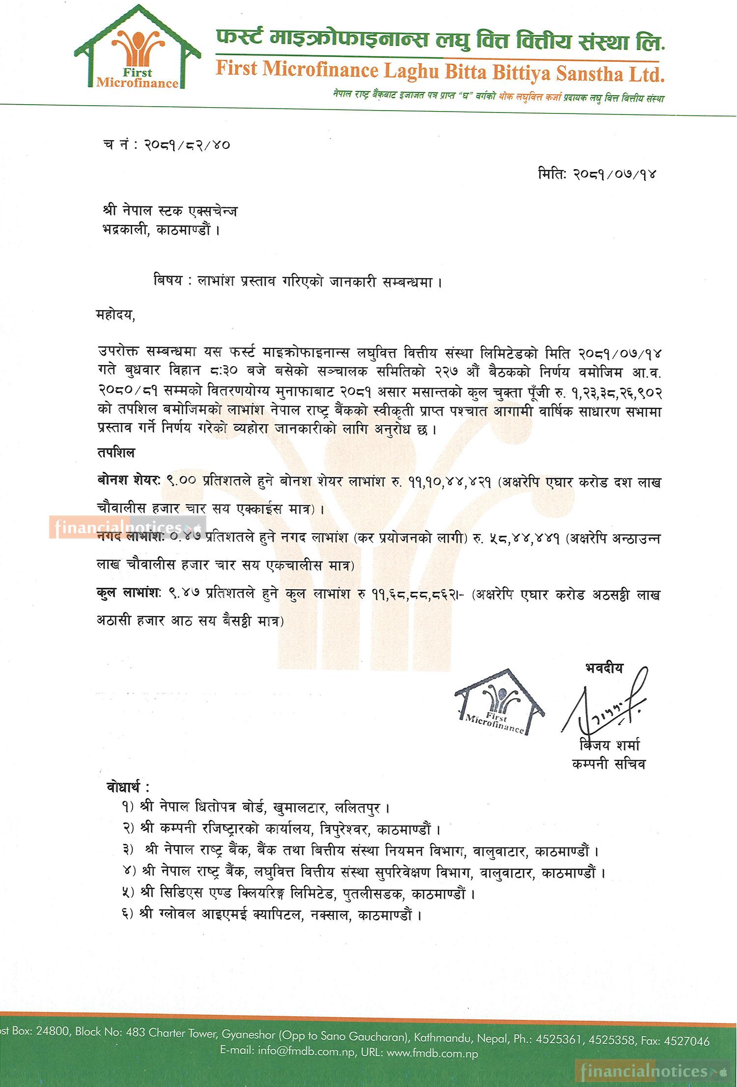 फर्स्ट माइक्रोफाइनान्सको लाभांश घोषणा सम्बन्धी सूचना