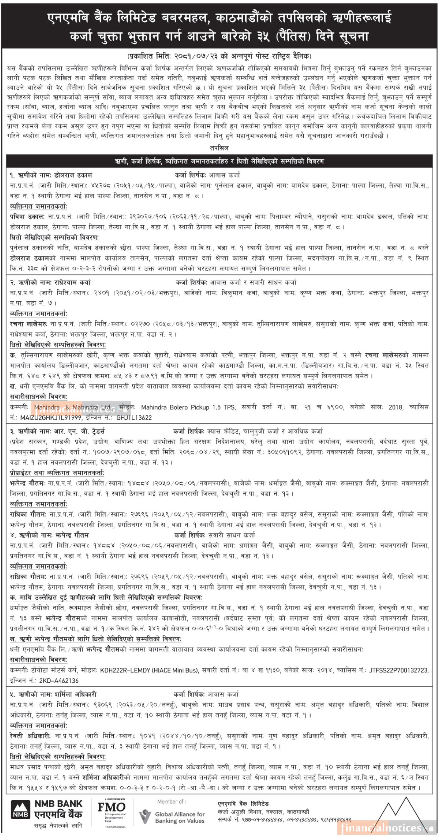 ऋणीहरुलाई ऋणकर्जा चुक्ता भुक्तान गर्नेबारे ३५ दिने सूचना -