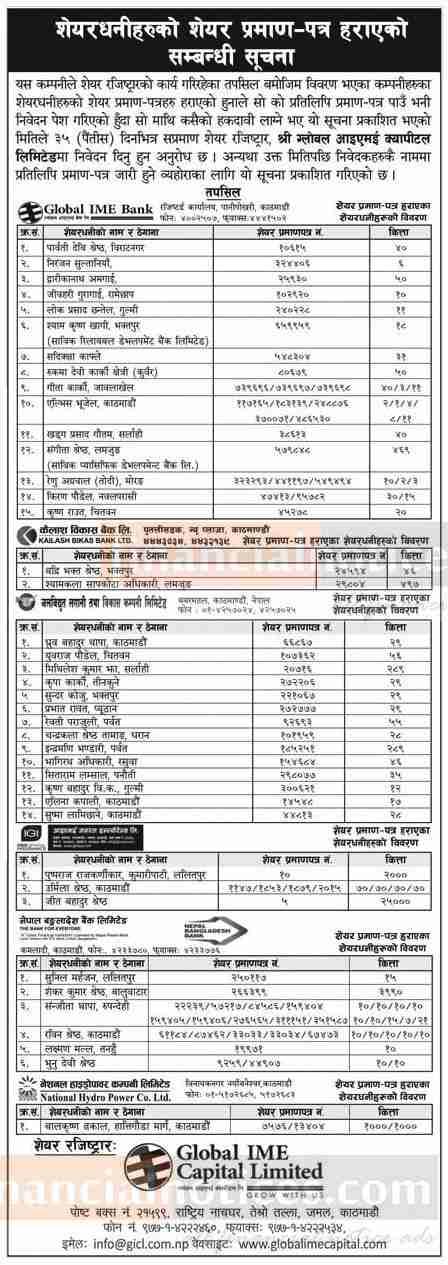 सेयर प्रमाणपत्रको लागि हकदावीको सूचना